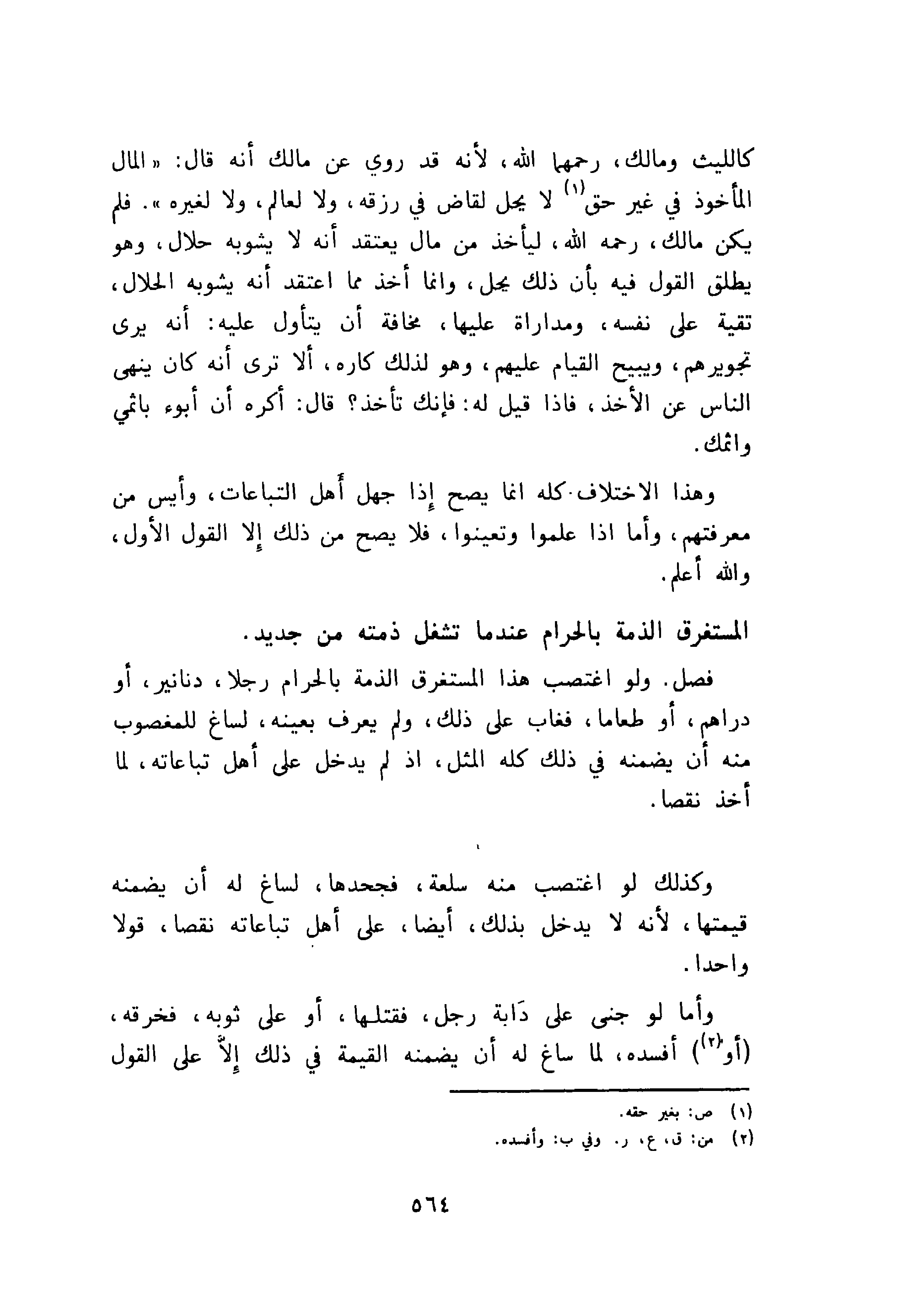 كالليث ومالك، رحمهما الله لأنه قد روي عن مالك أنه قال: المال المأخوذ في غير حق لا يحل لقاض في رزقه، ولا لعالم ولا لغيره. فلم يكن مالك، رحمه الله ليأخذ من مال يعتقد أنه لا يشوبه حلال، وهو يطلق القول فيه بأن ذلك يحل، وانما أخذ مما اعتقد أنه يشوبه الحلال تقية على نفسه ومداراة عليها، وهو لذلك كاره، ألا ترى أنه كان ينهى الناس عن الأخذ، فاذا قيل له: فإنك تأخذ؟ أكره أن أبوه باثمي واثمك.