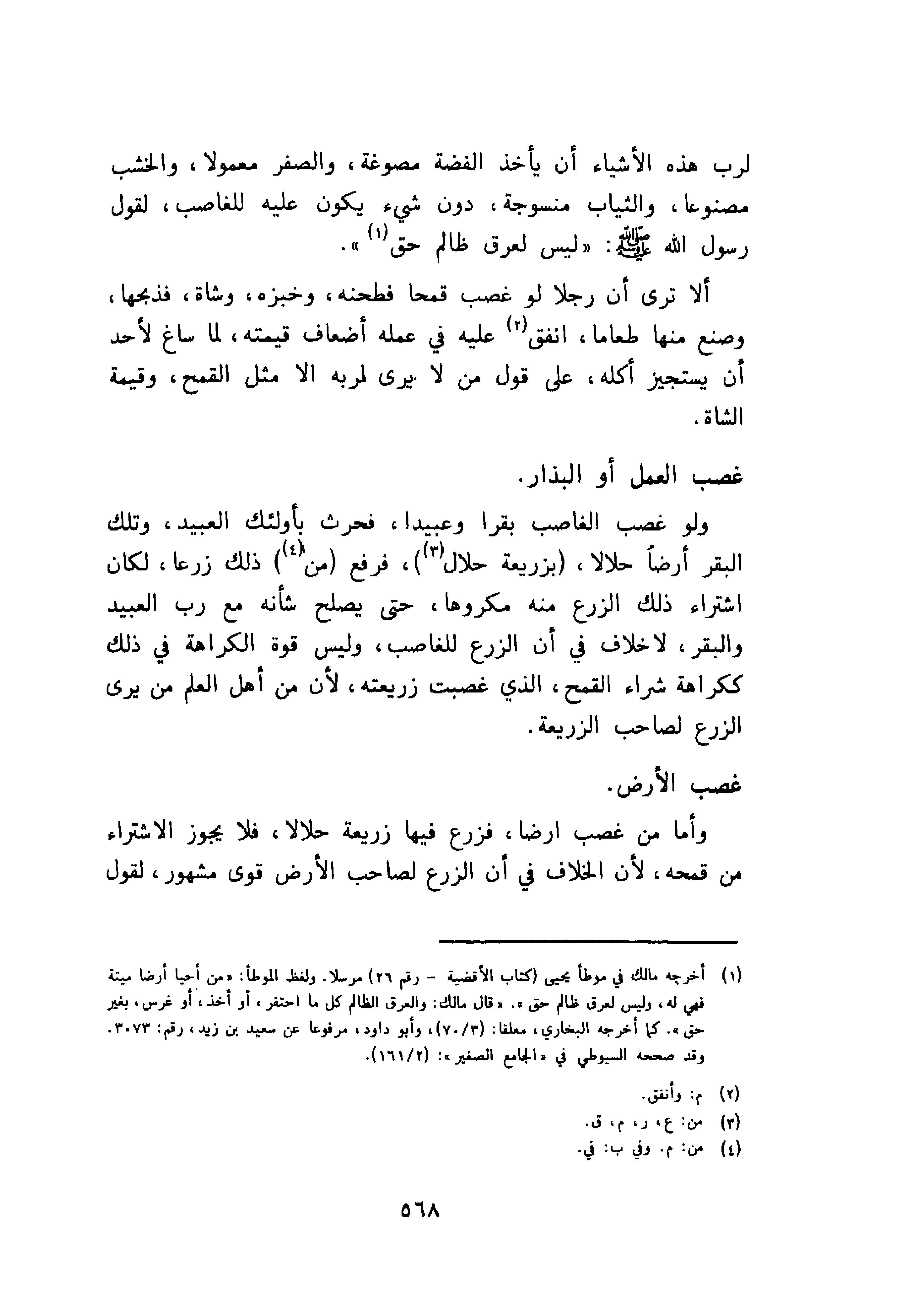 لرب هذه الاشياء أن يأخذ الفضة مصوغة، والصفر معمولا، والخشب مصنوعا، والثياب، دون شيء يكون عليه للغاصب، لقول رسول الله صلى الله عليه وسلم: {ليس لعرق ظالم حق}.
