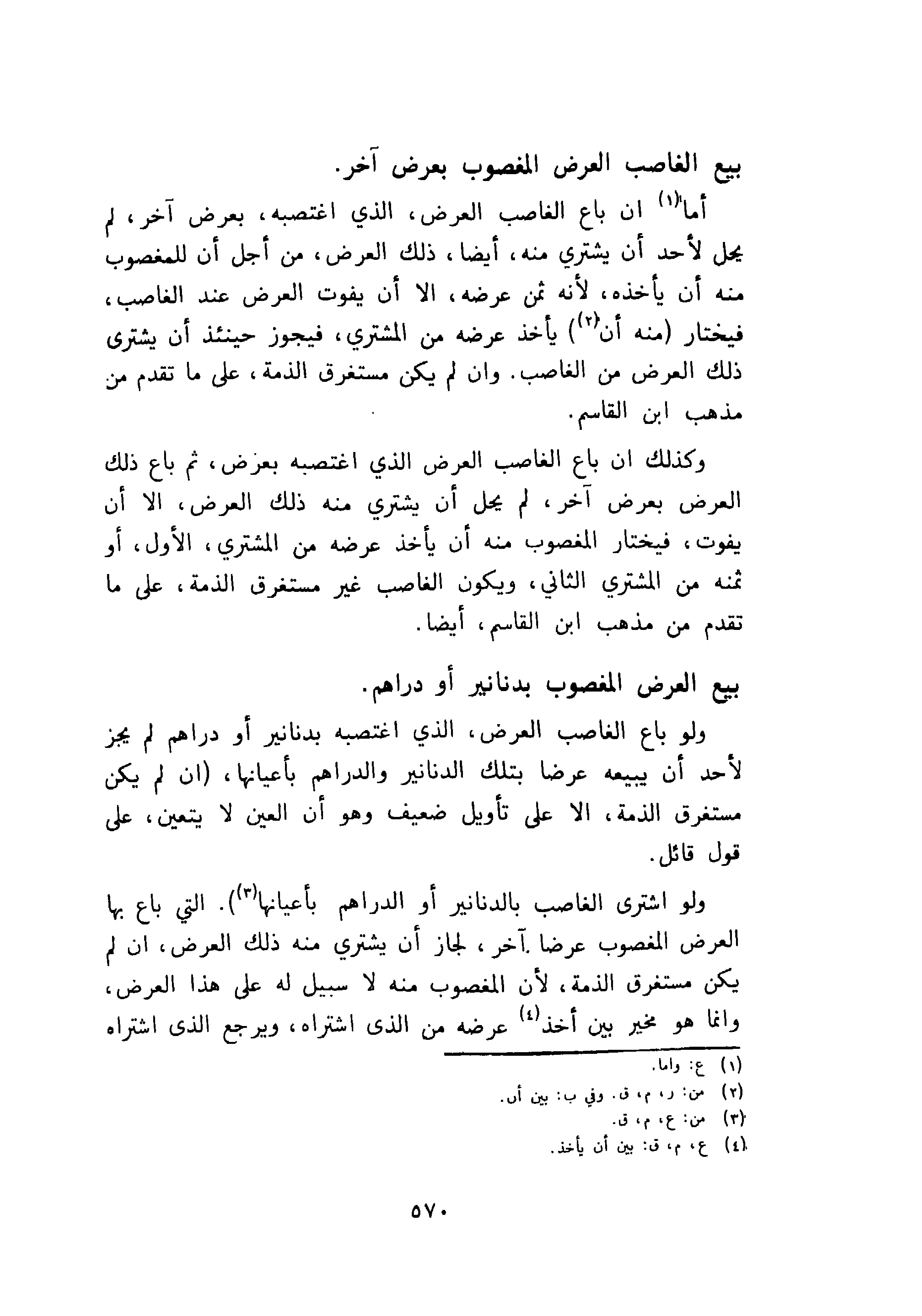 ولو باع الغاصب العرض، الذي اغتصبه بدنانير أو دراهم لم يجز لأحد أن يبيعه عرضا بتلك الدنانير والدراهم بأعيانها، ان لم يكن مستغرق الذمة، الا على تأويل ضعيف وهو أن العين لا يتعين، على قول قائل.