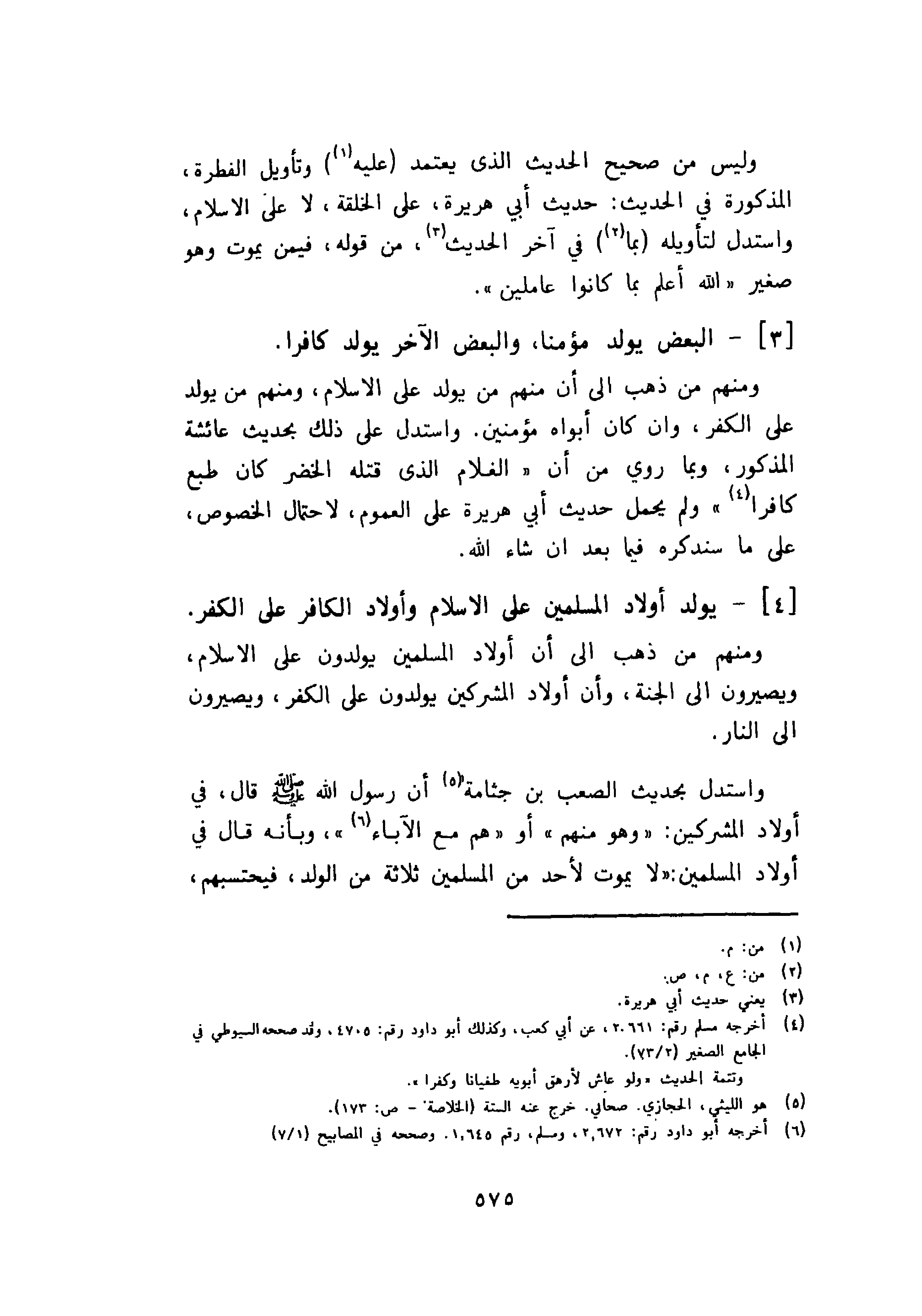 وليس من صحيح الحديث الذي يعتمد عليه وتأويل الفطرة المذكورة في الحديث: حديث أبي هريرة، على الخلقة، لا على الإسلام، واستدل لتأويله بما في آخر الحديث، من قوله، فيمن يموت وهو صغير " الله أعلم بما كانوا عاملين "