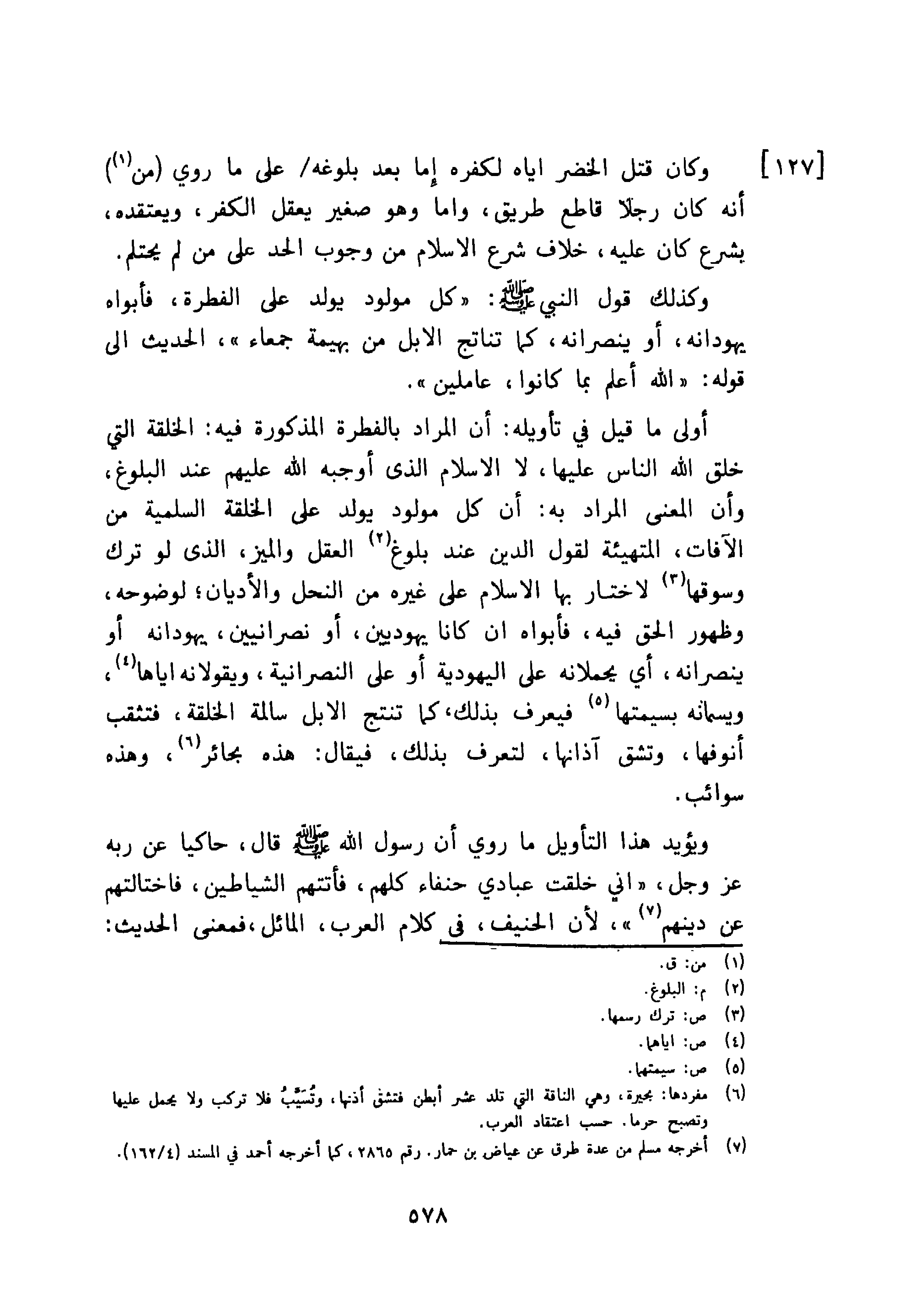 وكذلك قول النبي صلى الله عليه وسلم {كل مولود يولد على الفطرة، فأبواه يهودانه، أو ينصرانه، كما تناتج الابل من بهيمة جمعاء}، الحديث إلى قوله {الله أعلم بما كانوا عاملين}.