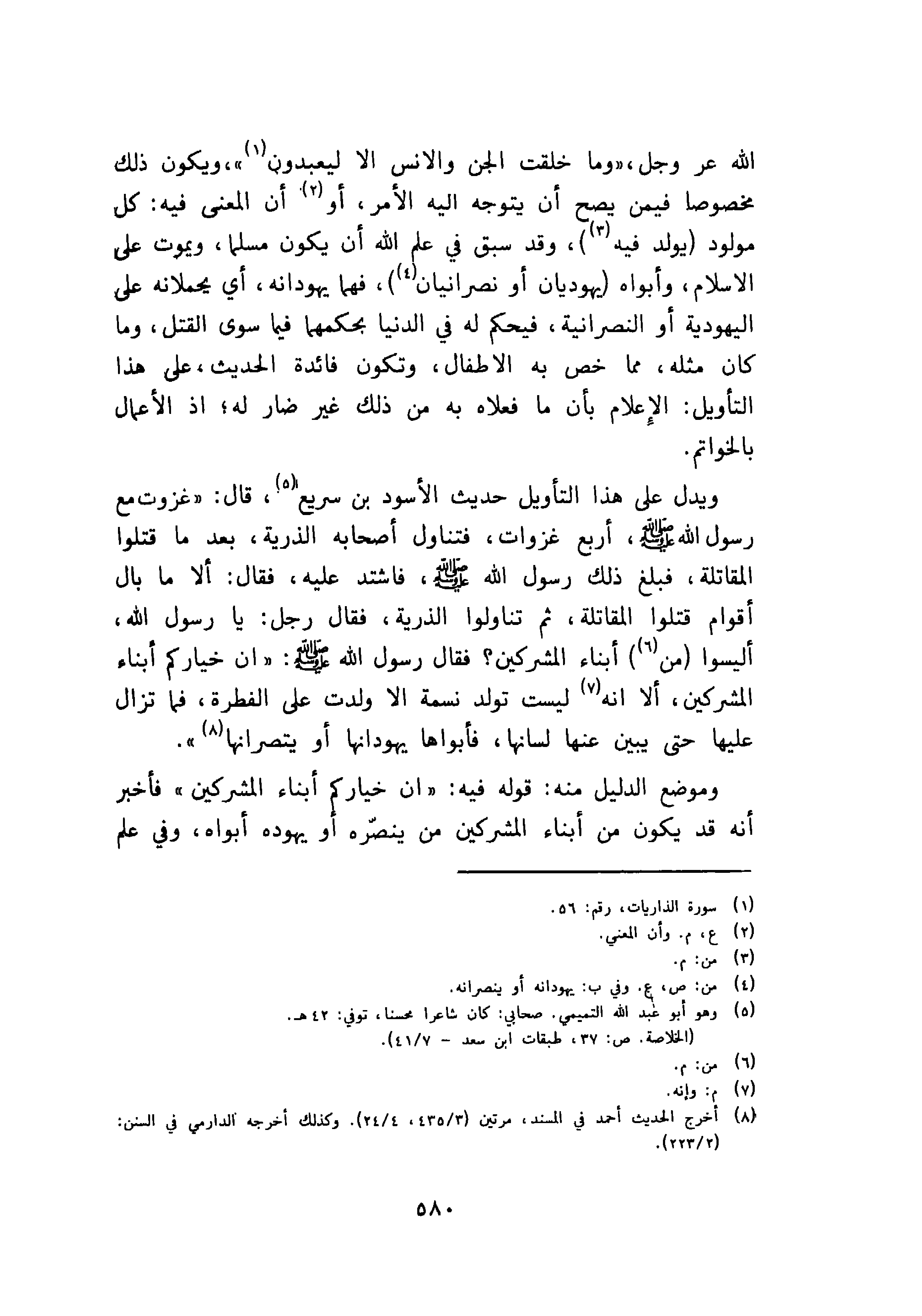 ويدل على هذا التأويل حديث الأسود بن سريع، قال: غزوت مع رسول الله صلى الله عليه وسلم، اربع غزوات، فتناول أصحابه الذرية، بعد ما قتلوا المقاتلة، فبلغ ذلك رسول الله صلى الله عليه وسلم، فاشتد عليه، فقال: ألا ما بال أقوام قتلوا المقاتلة، ثم تناولوا الذرية، فقال رجل: يارسول الله، أليسوا من أبناء المشركين؟ فقال رسول الله صلى الله عليه وسلم: انخياركم أبناء المشركين، ألا انه ليست تولد نسمة الا ولدت على الفطرة، فما تزال عليها حتى يبين عنها لسانها، فأبواها يهودانها أو يتصرانها. وموضع الدليل منه: قوله فيه ان خياركم أبناء المشركين فأخبر أنه قد يكون من أبناء المشركين من ينصره أو يهوده أبواه، وفي علم