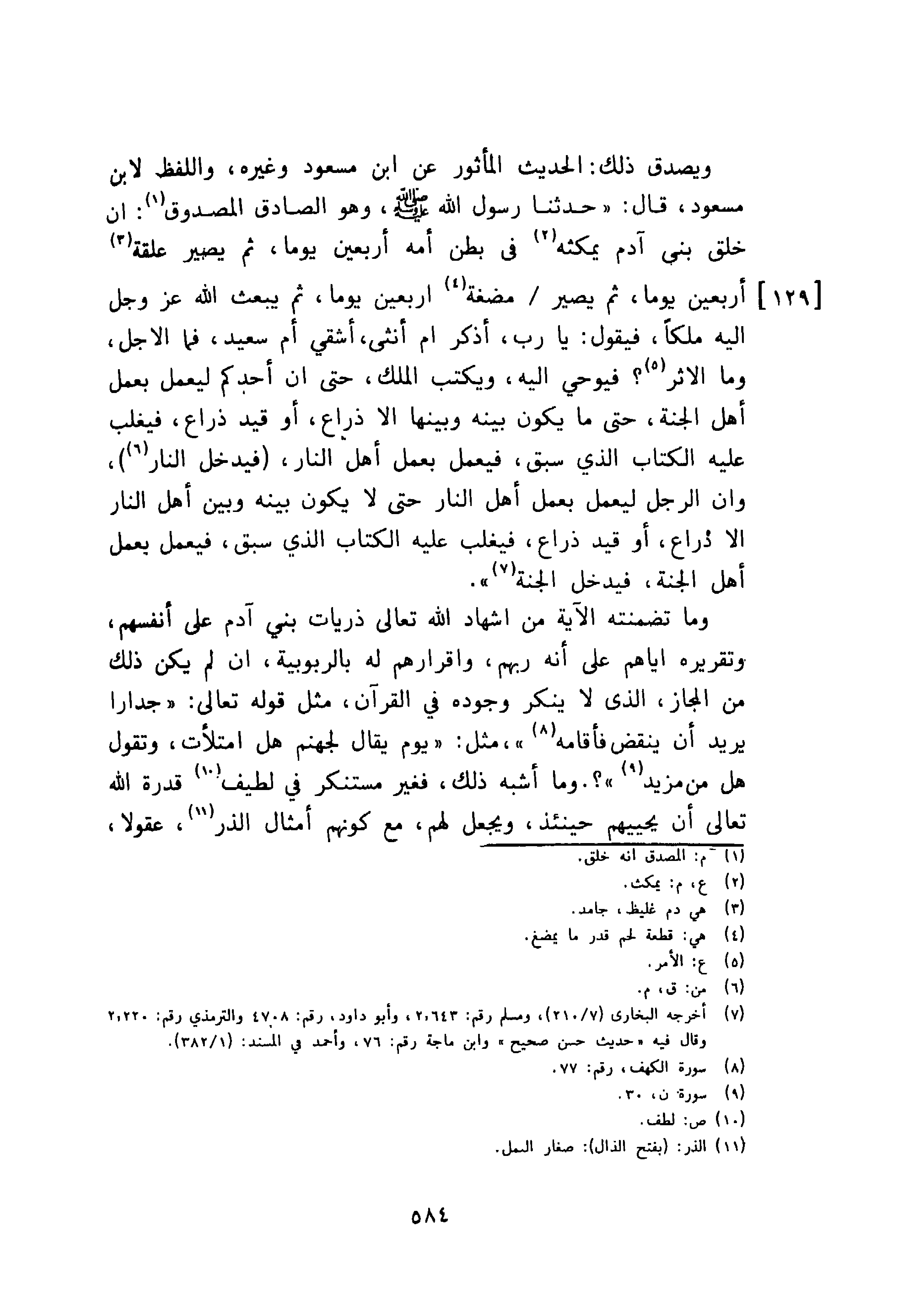 {حدثنا رسول الله صلى الله عليه وسلم، وهو الصادق المصدوق: ان خلق بني آدم يمكثه في بطن أمه أربعين يوما، ثم يصير علقة أربعين يوما، ثم يصير / مضغة اربعين يوما، ثم يبعث الله عز وجل اليه ملكا، فيقول: يارب، أذكر ام أنثى، أشقي أم سعيد، فما الاجل، وما الاثر؟ فيوحى اليه، ويكتب الملك، حتى ان أحدكم ليعمل بعمل اهل الجنة، حتى ما يكون بينه وبينها الا ذراع، أو قيد ذراع، فيغلب عليه الكتاب الذي سبق، فيعمل بعمل أهل النار فيدخل النار، وان الرجل ليعمل بعمل أهل النار حتى لا يكون بينه وبين أهل النار الا ذراع، أو قيد ذراع، فيغلب عليه الكتاب الذي سبق، فيعمل يعمل أهل الجنة، فيدخل الجنة.