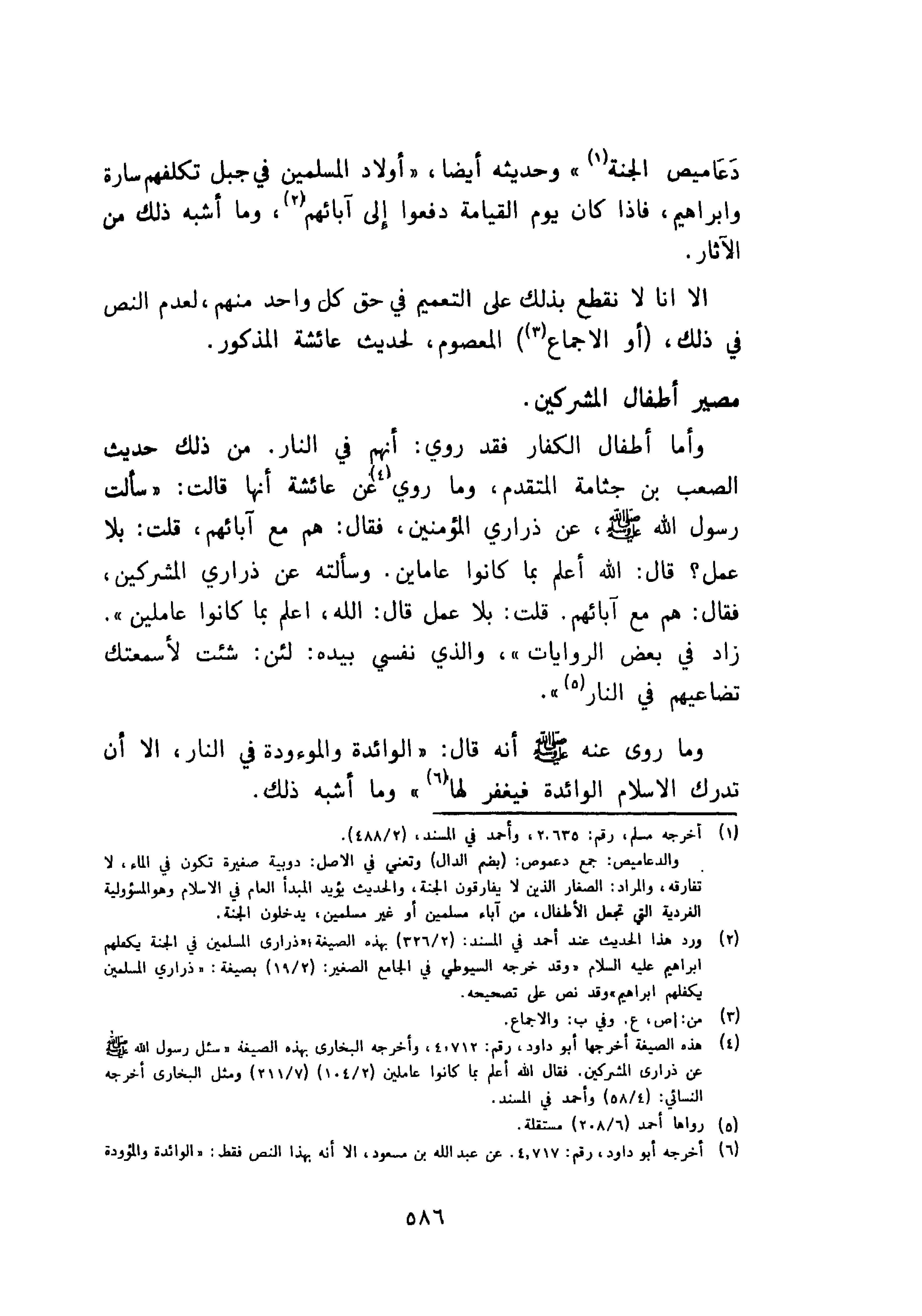 دعاميص الجنة " وحديثه أيضا أولاد المسلمين في جبل تكلفهم سارة وابراهيم، فاذا كان يوم القيامة دفعوا إلى آبائهم وما أشبه ذلك من الآثار.