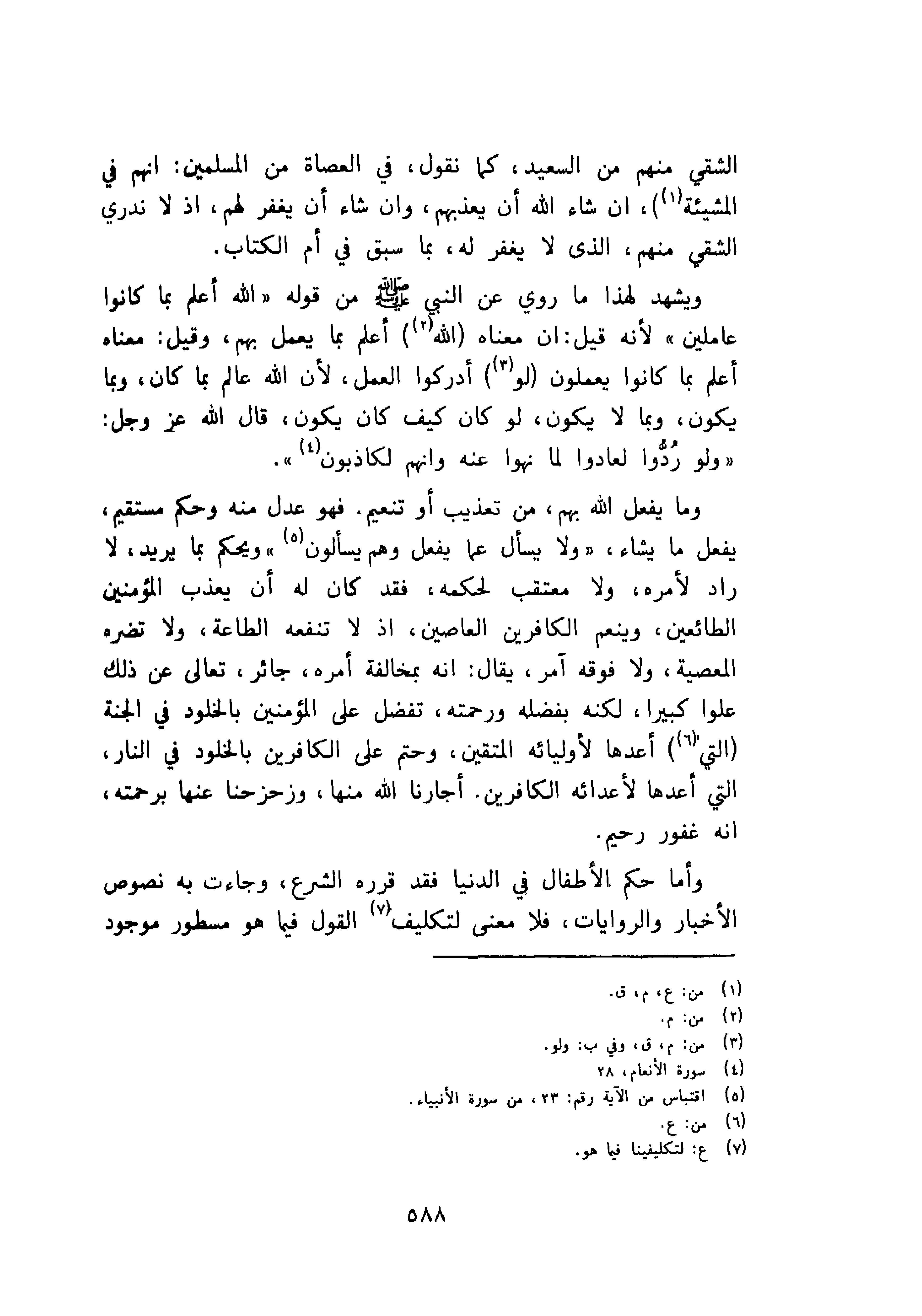 الشقي منهم من السعيد، كما نقول، في العصاة من المسلمين: انهم في المشيئة، ان شاء الله أن يعذبهم، وان شاء أن يغفر لهم، اذ لا ندري الشقي منهم الذي لا يغفر له، بما سبق في أم الكتاب.