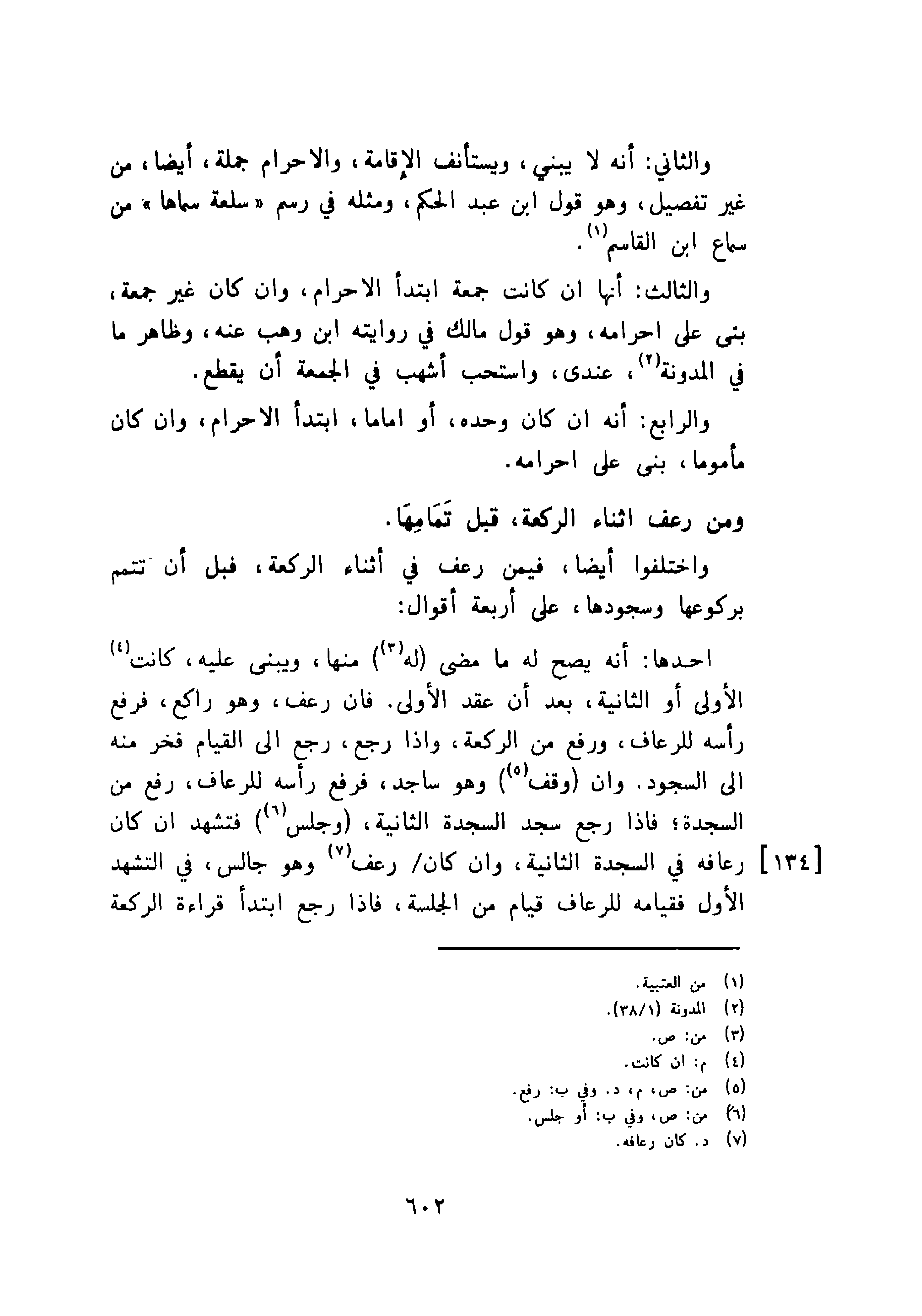 احدها: انه يصح له ما مضى له منها، ويبنى عليه، كانت الأولى أوالثانية، بعد أن عقد الأولى. فان رعف، وهو راكع، فرفع رأسه للرعاف، ورفع من الركعة، واذا رجع، رجع إلى القيام فخر منه إلى السجود. وان وقف وهو ساجد، فرفع رأسه للرعاف، رفع من السجدة؛ فاذا رجع سجد السجدة الثانية، وجلس فتشهد ان كان [134] رعافه في السجدة الثانية، وان كان / رعف وهو جالس، في التشهد الأول فقيامه للرعاف قيام من الجلسة، فاذا رجع ابتدأ قراءة الركعة