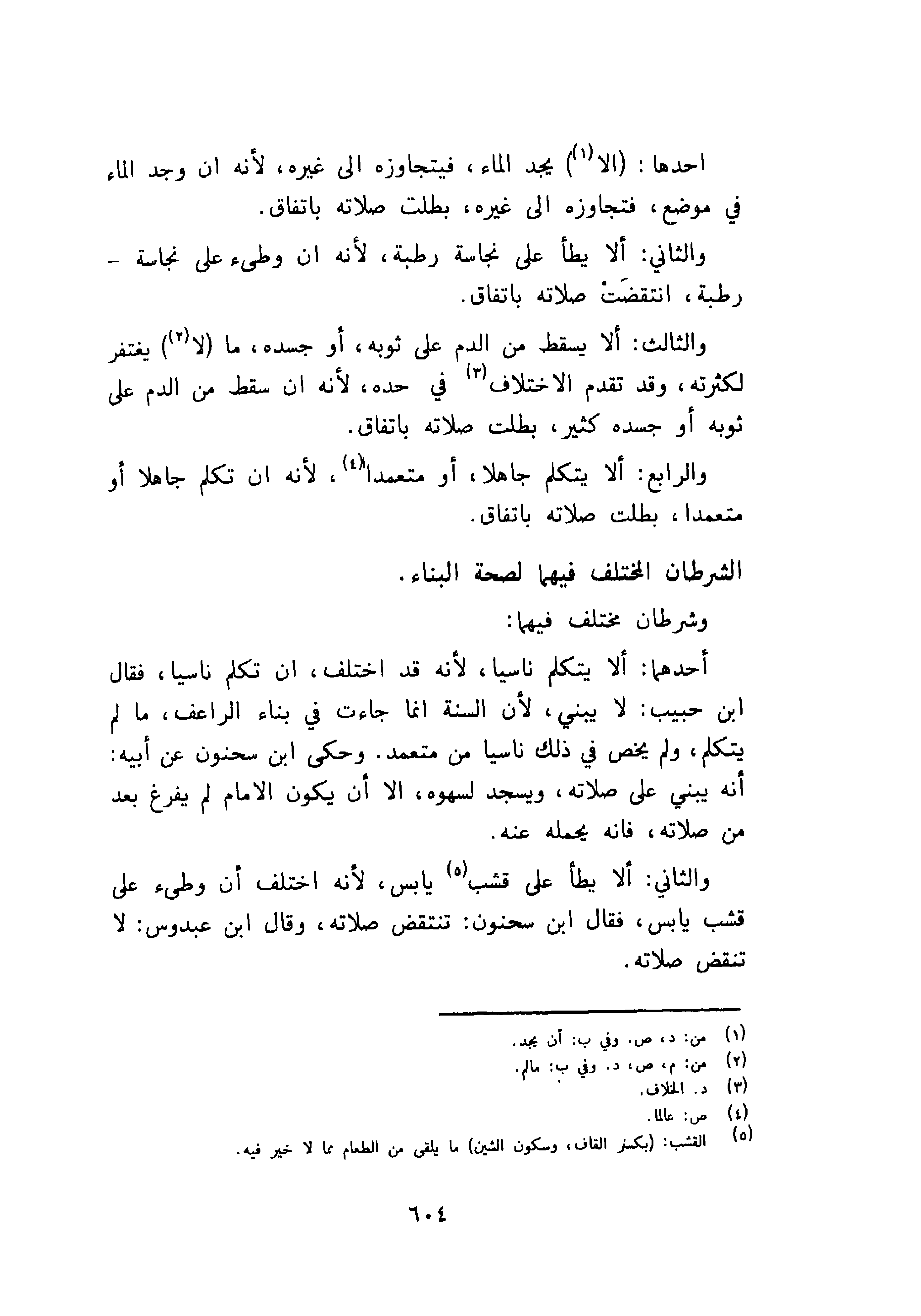 أحدهما: ألا يتكلم ناسيا، لأنه قد اختلف، تكلم ناسيا، فقال ابن حبيب: لا يبنى، لأن الاسنة انما جاءت في بناء الراعف، ما لم يتكلم، ولم يخص في ذلك ناسيا من متعمد. وحكى ابن سحنون عن أبيه: انه يبنى على صلاته، ويسجد لسهوه، الا أن يكون الإمام لم لم يفرغ بعد من صلاته، فانه يحمله عنه.