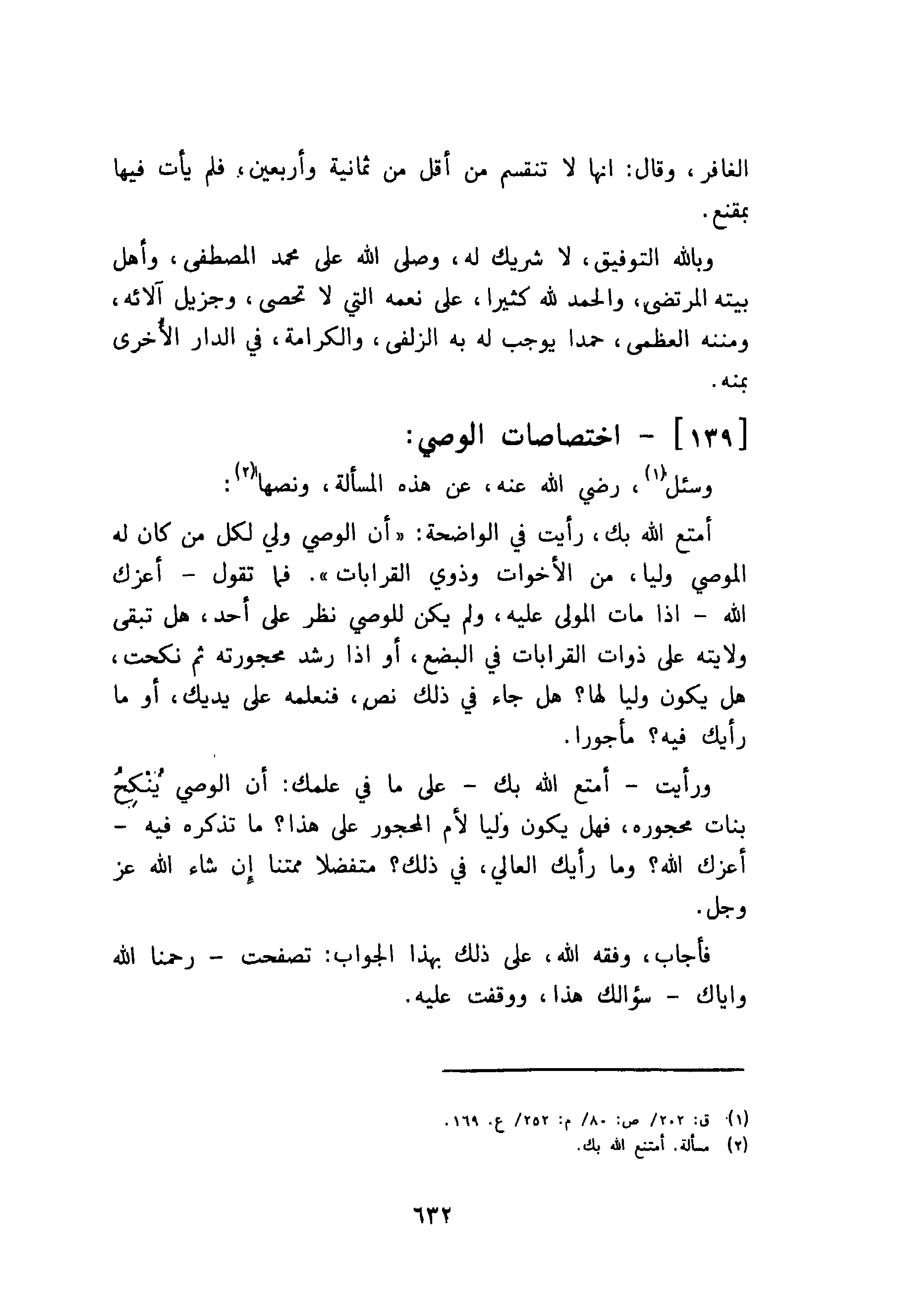 فأجاب وفقه الله، على ذلك بهذا الجواب: تصفحت رحمنا الله وإياك سؤالك ووقفت عليه.