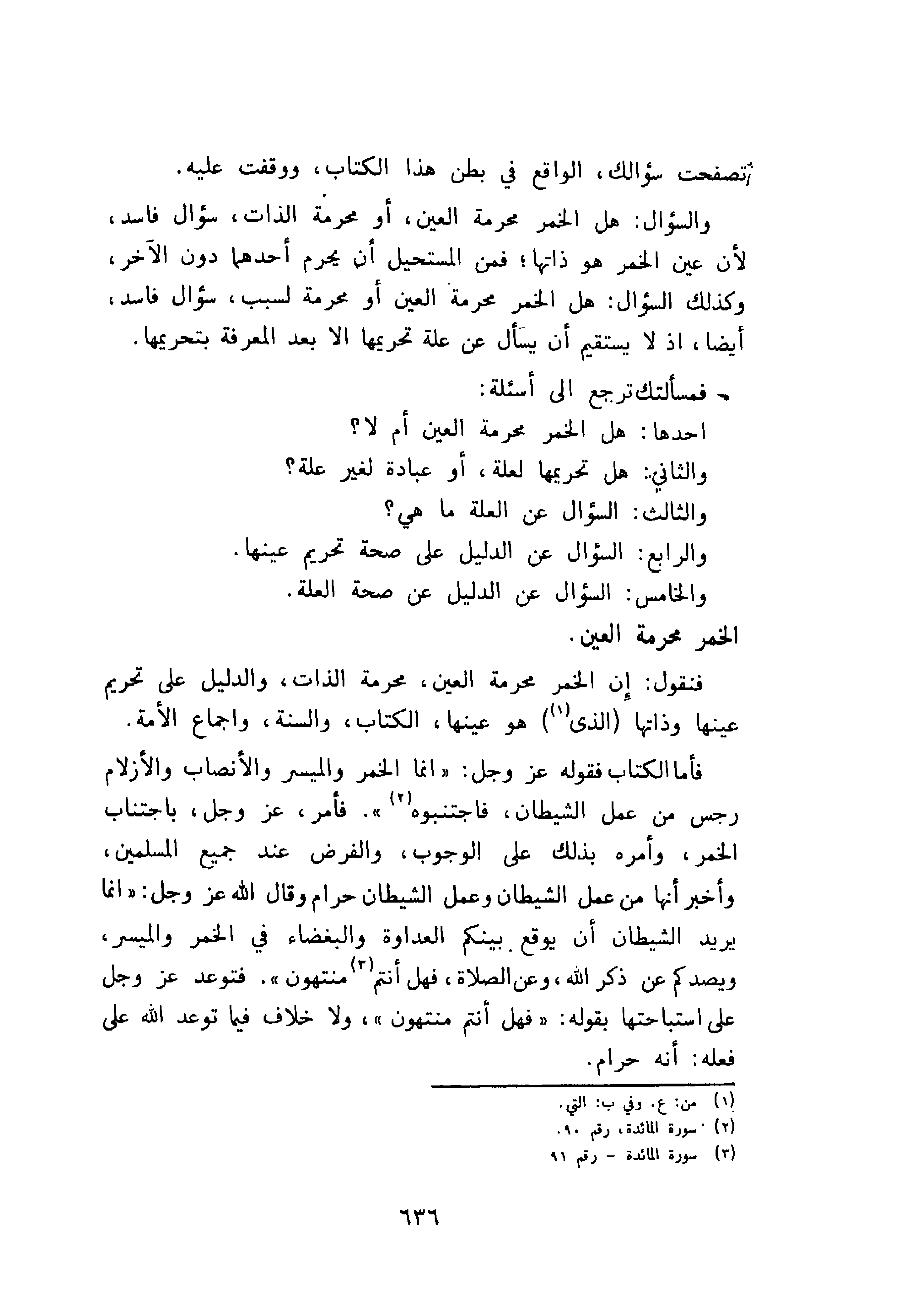 والسؤال: هل الخمر محرمة العين، أو محرمة الذات، سؤال فاسد لأن عين الخمر هو ذاتها؛ فمن المستحيل أن يحرم أحدهما دون الآخر وكذلك السؤال: هل الخمر محرمة العين أو محرمة لسبب، سؤال فاسد أيضا اذ لا يستقيم أن يسأل عن علة تحريمها الا بعد المعرفة بتحريمها.