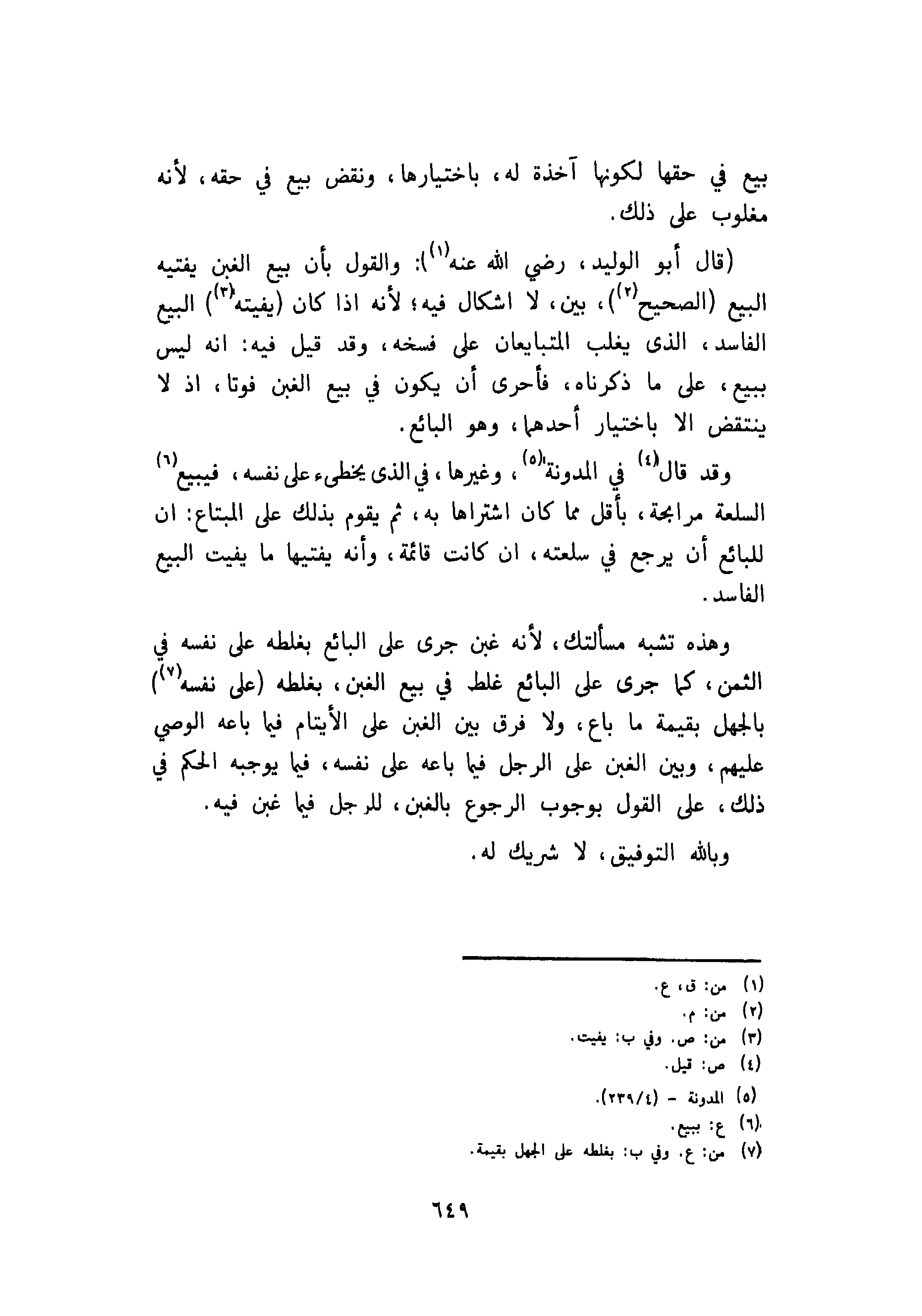 قال أبو الوليد رضي الله عنه: والقول بأن بيع الغبن يفتيه البيه الصحيح، بين لا اشكال فيه؛ لأنه إذا كان يفتيه البيع الفاسد، الذي يغلب المتبايعان على فسخه، وقد قيل: انه ليس ببيع، على ما ذكرناه، فأحرى أن يكون في بيع الغبن فوتا، اذ لا ينتقض الا باختيار أحدهما، وهو البائع.