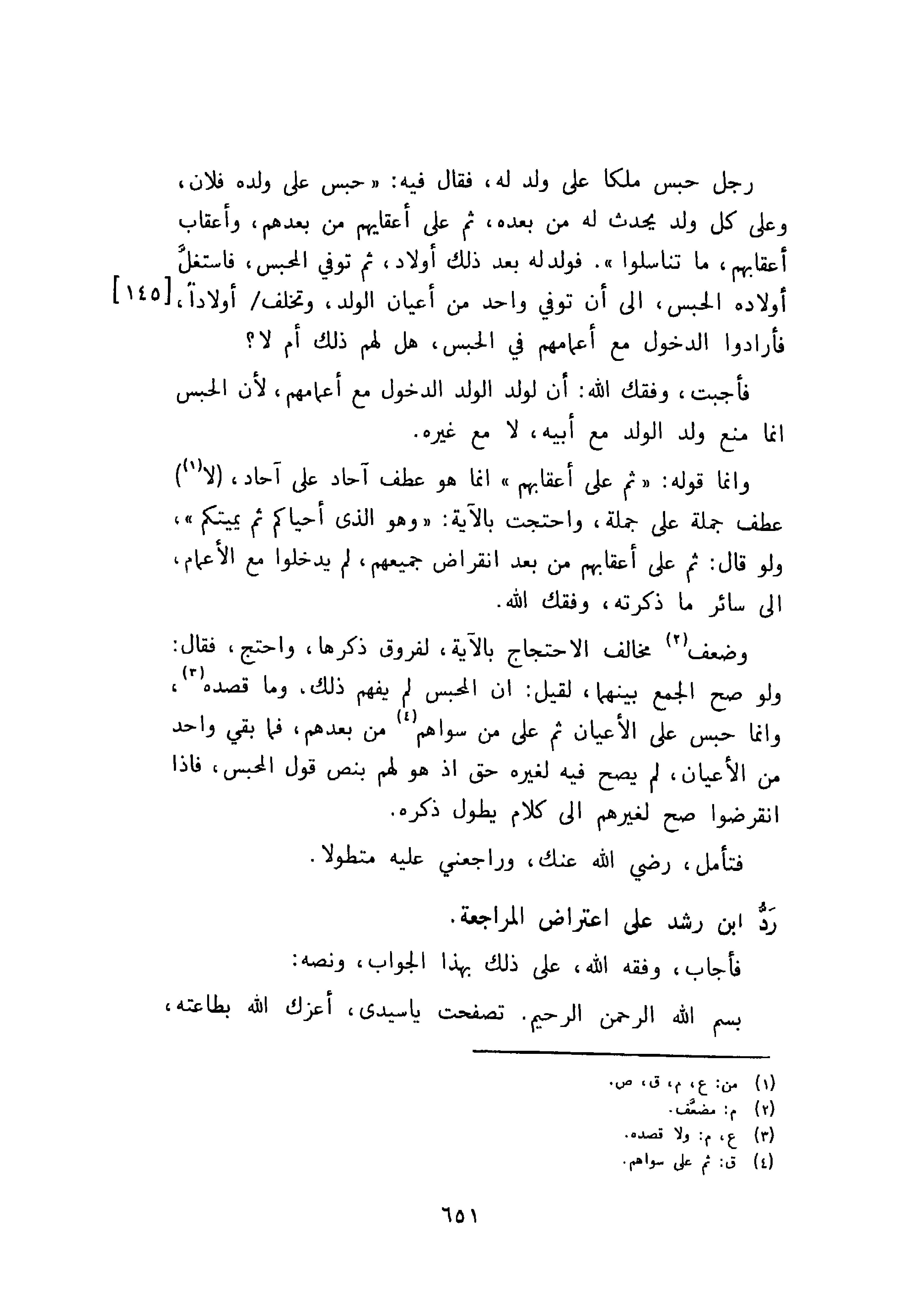 وضعيف مخالف الاحتجاج بالأية، لفروق ذكرها، واحتج، فقال ولو صح الجمع بينهما، لقيل: ان المحبس لم يفهم ذلك، وما قصده وانما حبس على الأعيان ثم على من سواهم من بعدهم، فما بقي واحد من الأعيان، لم يصح فيه لغيره حق البائع هو لهم بنص قول المحبس، فاذا انقرضوا صح لغيرهم إلى كلام يطول ذكره.
