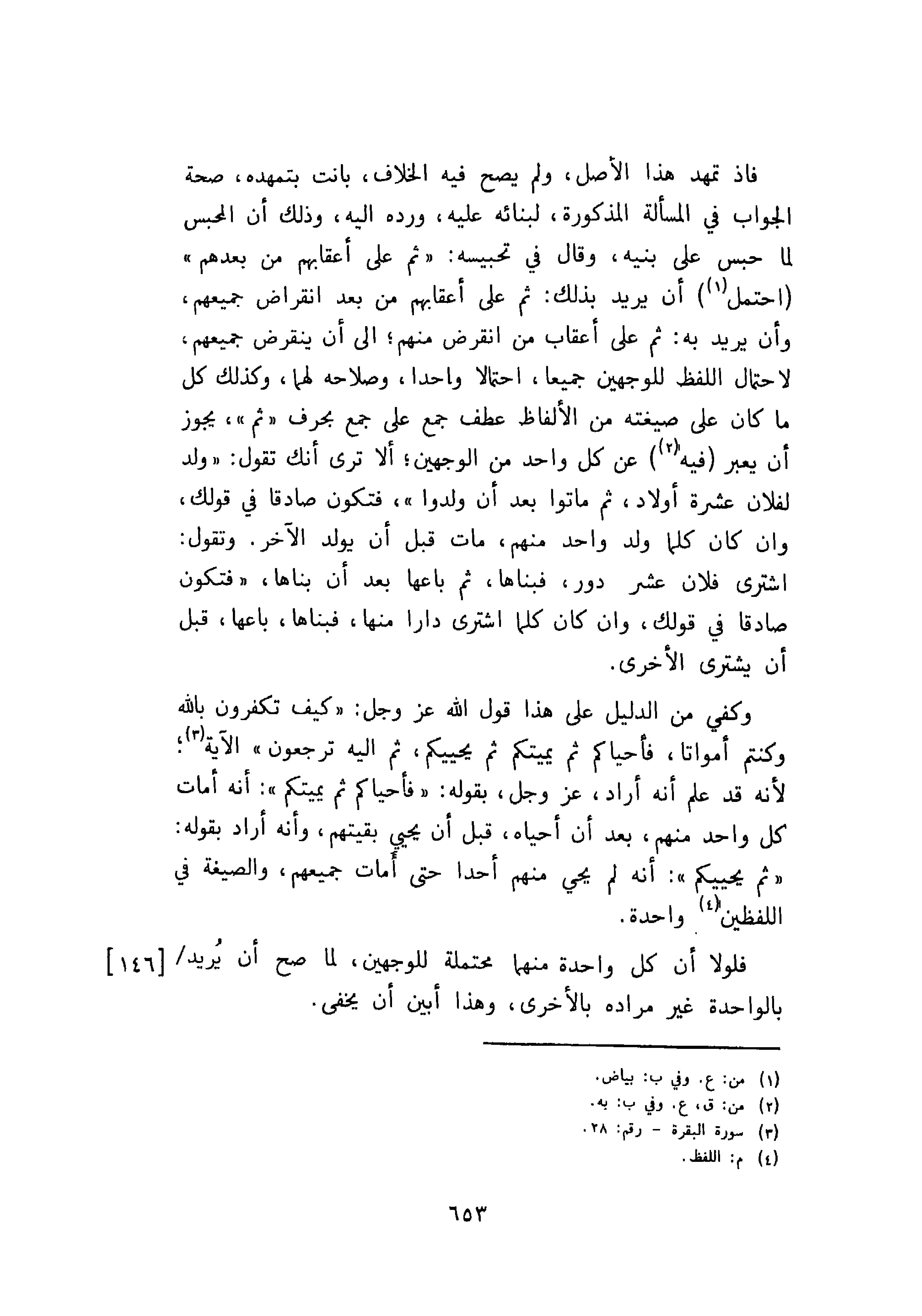 فاذ تمهد هذا الاصل، ولم يصح فيه الخلاف، بانت بتمهده، صحة الجواب في المسألة المذكورة، لبنائه عليه، ورده اليه، وذلك أن المحبس لما حبس على بنيه، وقال في تحبيسه: ثم على أعقابهم من بعدهم احتمل أن يريد بذلك: ثم على أعقابهم من بعد انقراض جميعهم وأن يريد به: ثم على أعقاب من انقرض منهم؛ إلى أن ينقرض جميعهم، لاحتمال اللفظ للوجهين جميعا، احتمالا واحدا، وصلاحه لهما، وكذلك كل ما كان على صيغته من الألفاظ عطف جمع على جمع بحرف ثم يجوز أن يعبر فيه عن كل واحد من الوجهين؛ ألا ترى أنك تقول: ولد لفلان عشرة أولاد، ثم ماتوا بعد أن ولدوا، فتكون صادقا في قولك، وان كان كلما ولد واحد منهم، مات قبل أن يولد الآخر. وتقول: اشترى فلان عشر دور فبناها، ثم باعها بعد أن بناها، فتكون صادقا في قولك، وان كان كلما اشترى دارا منها، فبناها، باعها، قبل أن يشترى الأخرى.