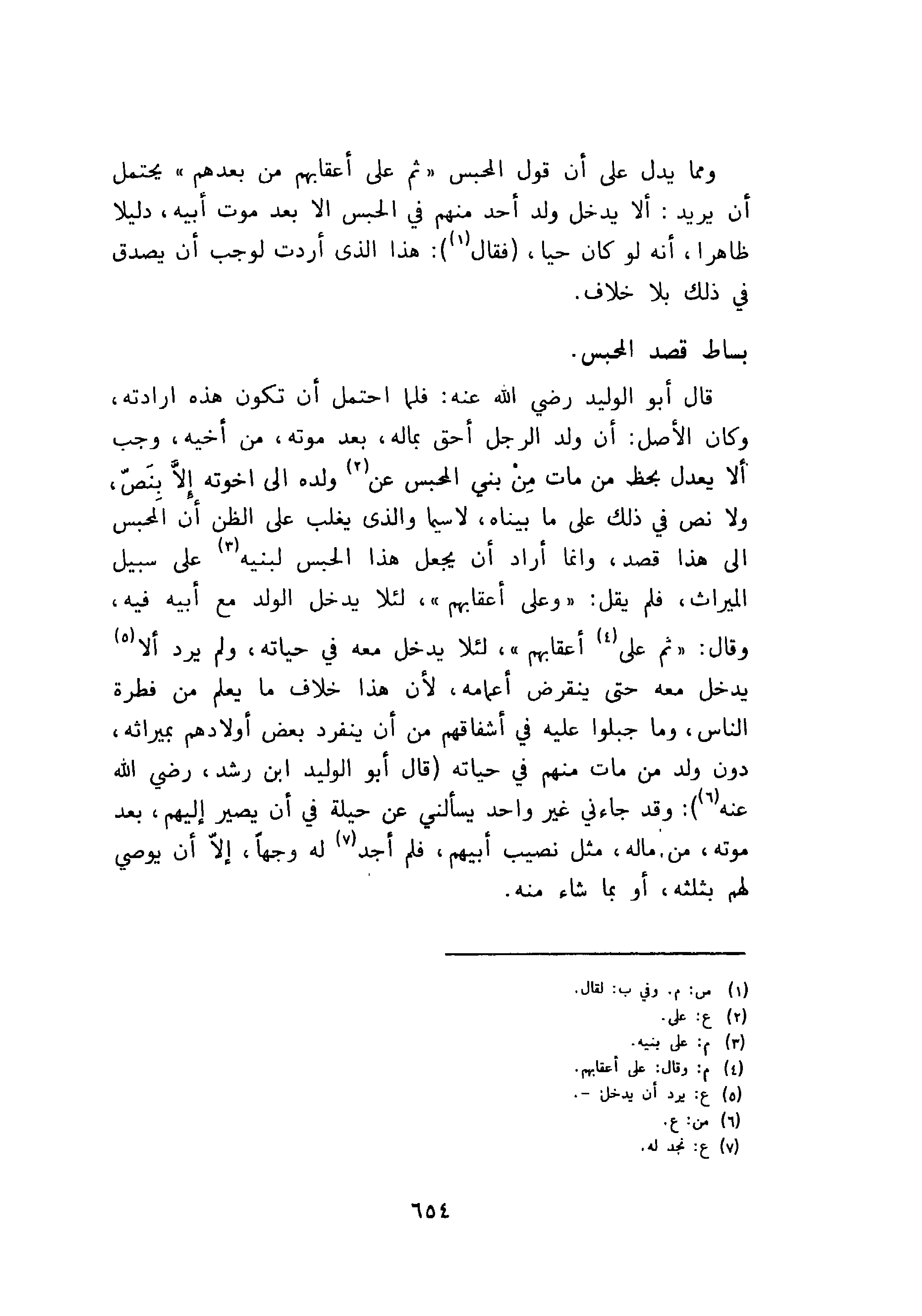 قال أبو الوليد رضي الله عنه: فلما احتمل أن تكون هذه ارادته، وكان الاصل: أن يولد الرجل أحق بماله، بعد موته، من أخيه، وجب الا يعدل بحظ من بني المحبس عن ولده إلى اخوته إلا بنص ولا نص في ذلك على ما بيناه، لاسيما والذي يغلب على الظن أن المحبس إلى هذا قصد وانما أراد ان يجعل هذا الحبس لبنيه على سبيل الميراث، فلم يقل: وعلى أعقابهم، لئلا يدخل الولد مع أبيه فيه وقال: ثم على اعقابهم، لئلا يدخل معه في حياته، ولم يرد ألا يدخل معه حتى ينقرض أعمامه، لأن هذا خلاف ما يعلم من فطرة الناس وما جبلوا عليه في أشفاقهم من أن ينفرد بعض اولادهم بميراثه، دون ولد من مات منهم في حياته قال أبو الوليد ابن رشد، رضي الله عنه: وقد جاءني غير واحد يسألني عن حيلة في أن يصير إليهم، بعد موته من ماله، مثل نصيب أبيهم، فلم أجد له وجها إلا ان يوصي لهم بثلثه، أو بما شاء منه.