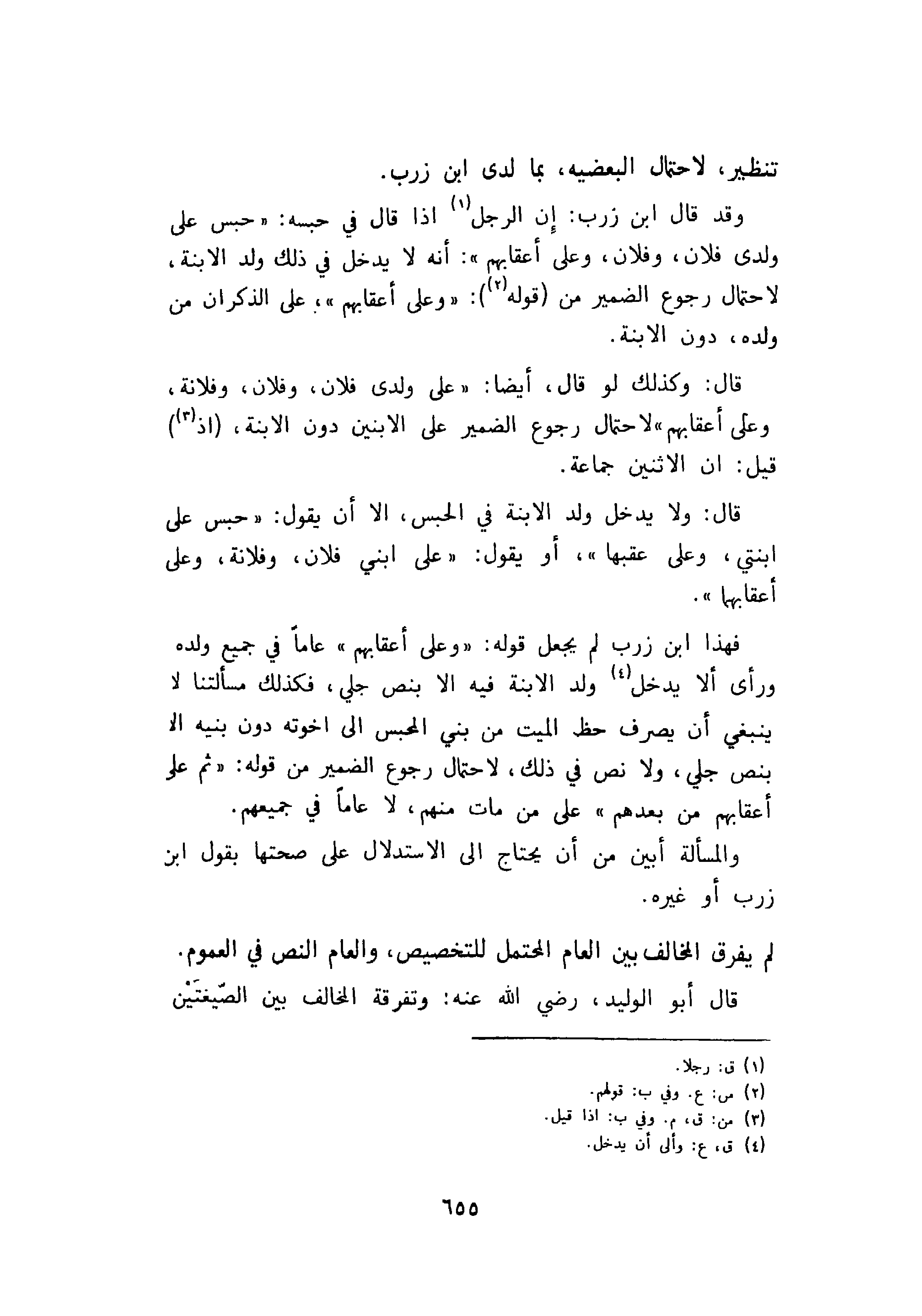 فهذا ابن زرب لم يجعل قوله: وعلى أعقابهم عاماً في جميع ولده ورأى ألا يدخل ولد الابنة فيه الا بنص جلي فكذلك مسألتنا لا ينبغي أن يصرف حظ الميت من بني المحبس إلى اخوته دون بنيه الا بنص جلي ولا نص في ذلك، لاحتمال رجوع الضمير من قوله: ثم على أعقابهم من بعدهم على من مات منهم، لا عاما في جميعهم.