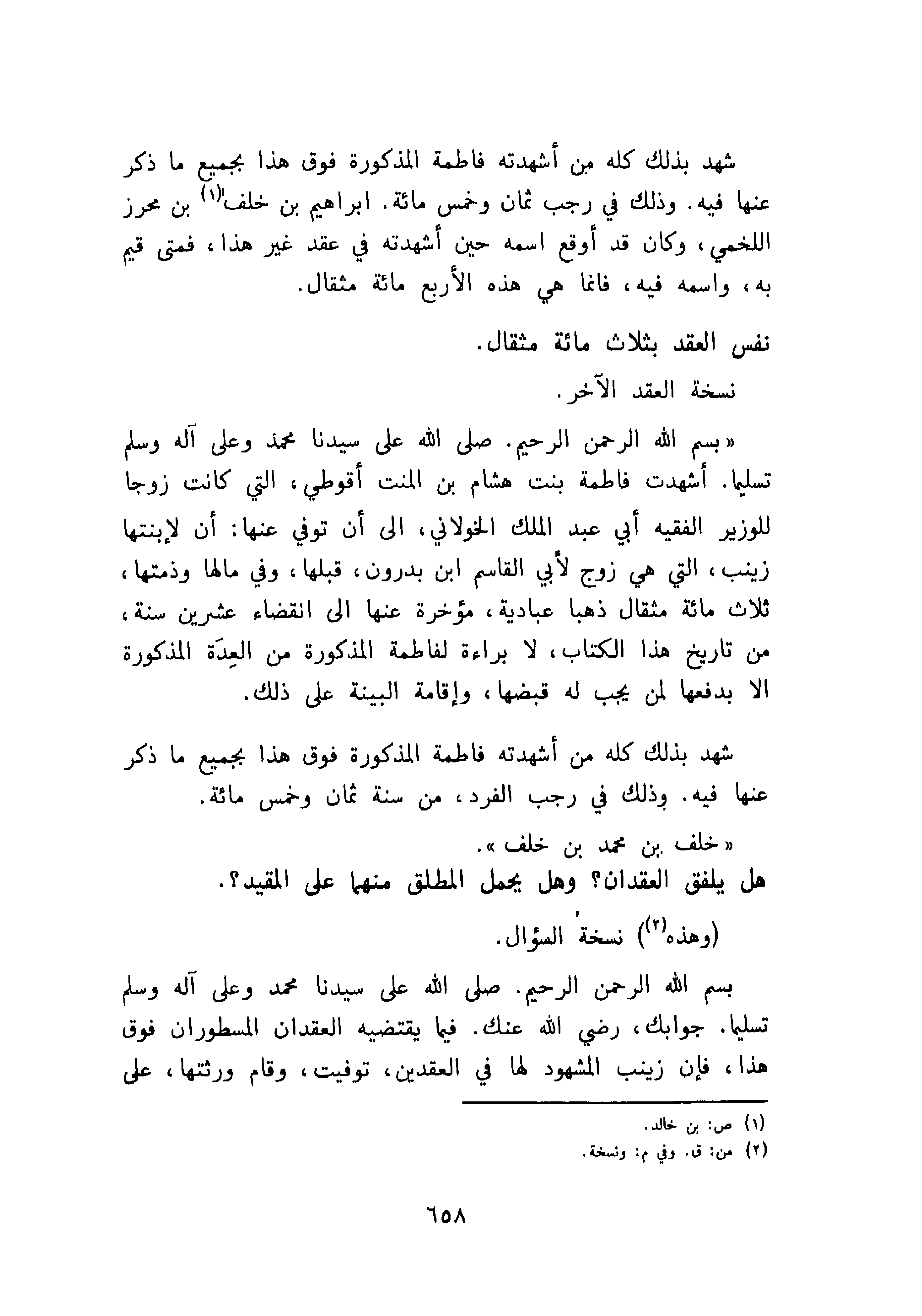 بِسْمِ اللَّهِ الرَّحْمَنِ الرَّحِيمِ. صلى الله على سيدنا محمد وعلى آله وسلم تسليما جوابك رضي الله عنك. فيما يقتضيه العقدان المسطوان فوق هذا فإن زينب المشهود لها في العقدين، وتوفيت، وقام ورثتها، على