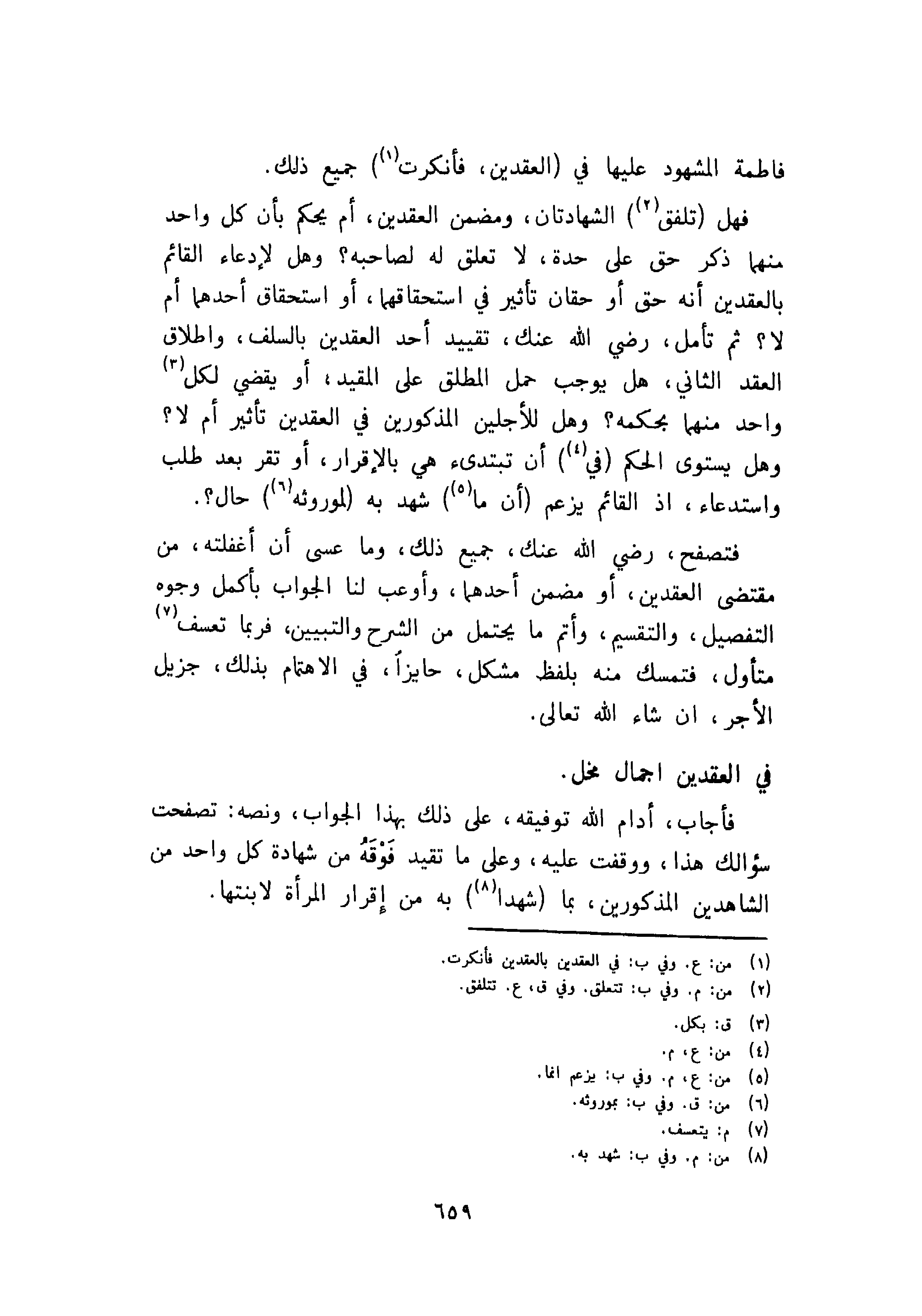 فأجاب أدام الله وتوفيقه، على ذلك بهذا الجواب، ونصه: تصفحت سؤالك هذا، ووقفت عليه، وعلى ما تقيد فوقه من شهادة كل واحد من الشاهدين المذكورين، بما شهدا به من إقرار المرأة لابنتها.