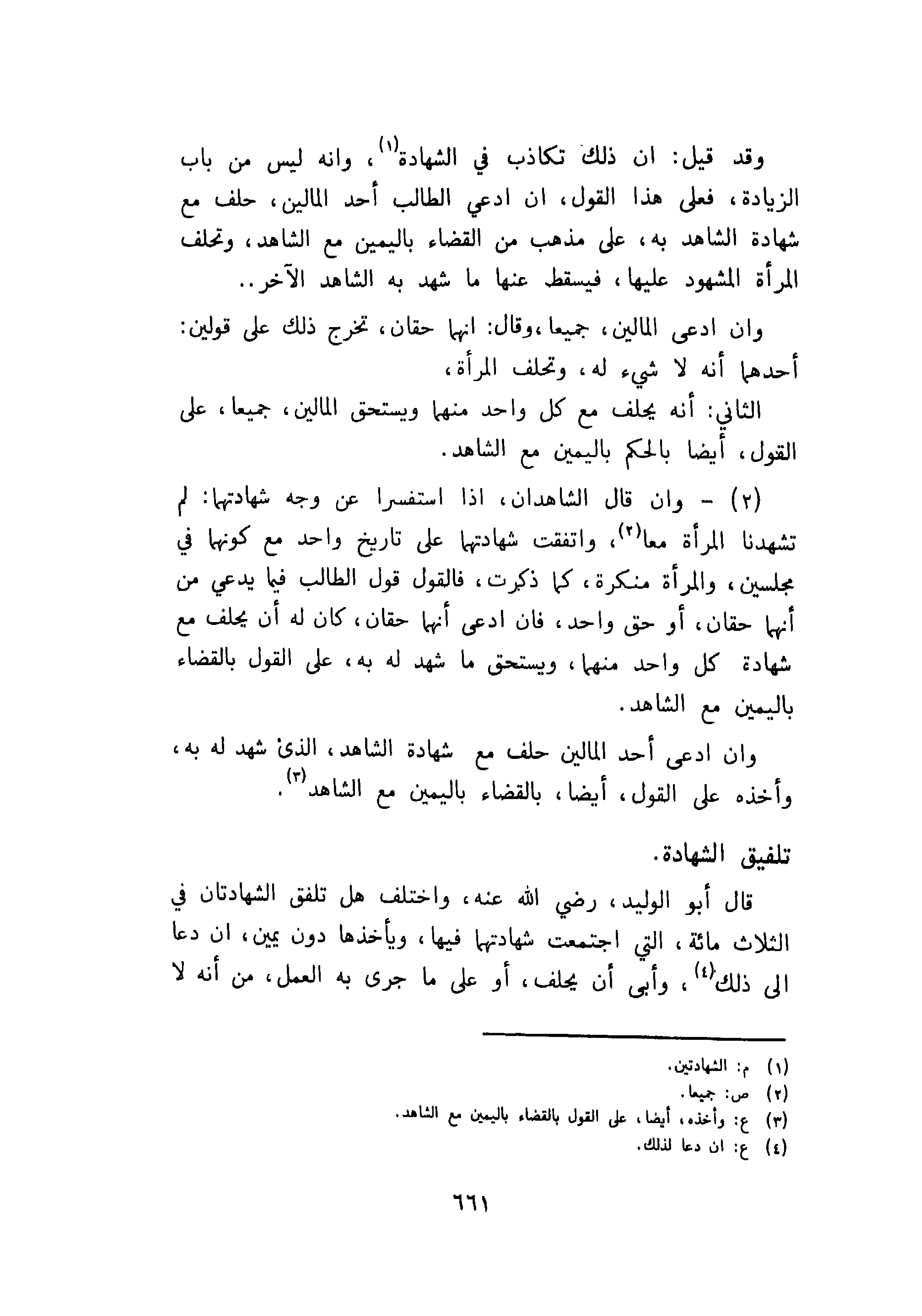 قال أبو الوليد، رضي الله عنه، واختلف هل تلفق الشهادتان في الثلاث مائة، التي اجتمعت شهادتهما فيها، ويأخذها دون يمين، ان دعا إلى ذلك وأبى أن يحلف، أو على ما جرى به العمل، من أنه لا