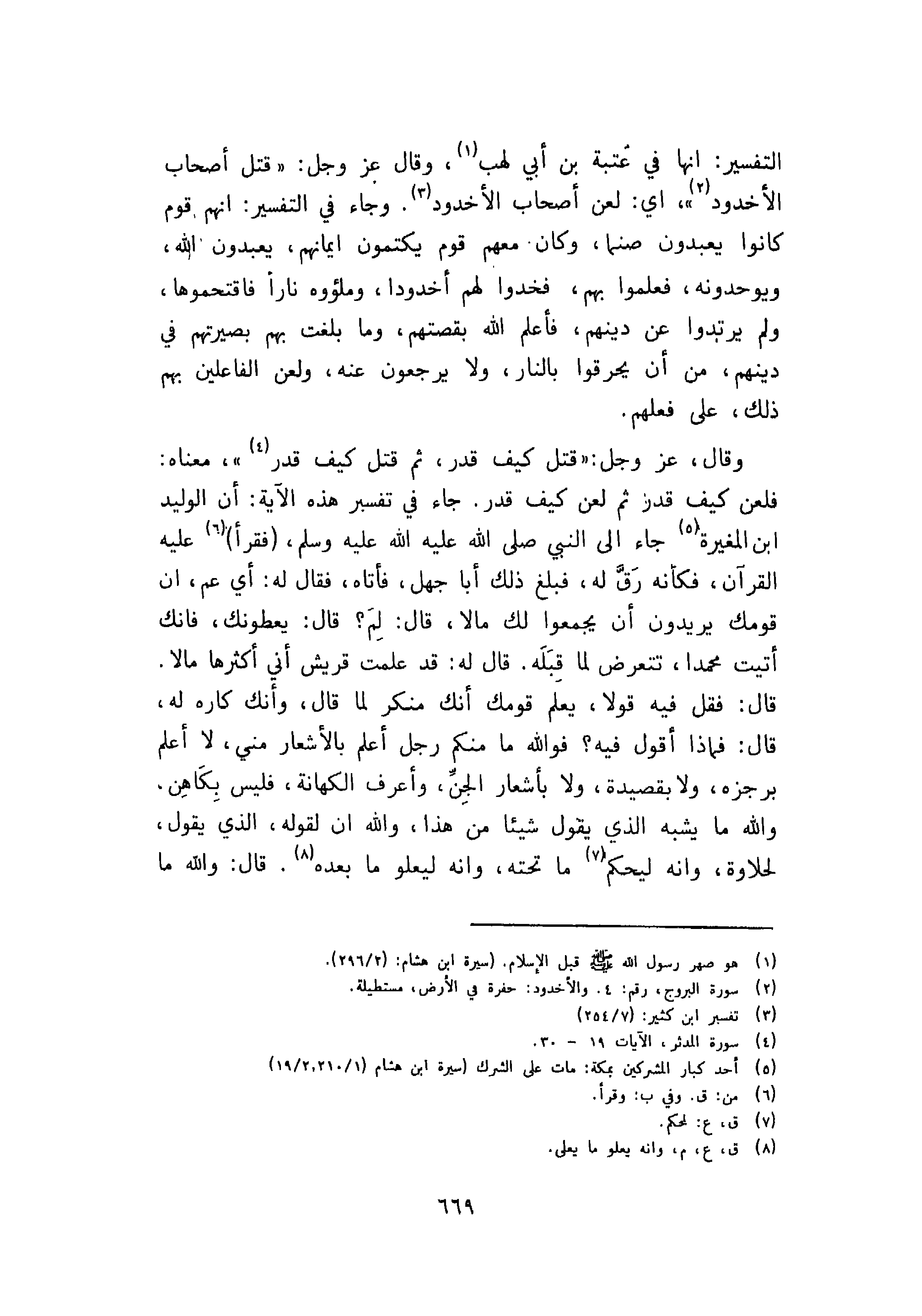 وقال، عز وجل {قتل كيف قدر، ثم قتل كيف قدر}، معناه: فلعن كيف قدر ثم لعن كيف قدر. جاء في تفسير هذه الآية: أن الوليد ابن المغيرة جاء إلى النبي صلى الله عليه وسلم، فقرأ عليه القرآن، فكأنه رق له، فبلغ ذلك أبا جهل، فأتاه، فقال له: أي عم، ان قومك يريدون أن يجمعوا لك مالا، قال: لم؟ قال: يعطونك، فانك أتيت محمدا، تتعرض لما قبله. قال له: قد علمت قريش أني أكثرها مالا. قال: فقل فيه قولا، يعلم قومك أنك منكر لما قال، وأنك كاره له، قال: فماذا أقول فيه؟ فوالله ما منكم رجل أعلم بالأشعار مني، لا أعلم برجزه، ولا بقصيدة، ولا بأشعار الجن، وأعرف الكهانة، فليس بكاهن، والله ما يشبه الذي يقول شيئاً من هذا، والله ان لقوله، الذي يقول، لحلاوة، وانه ليحكم ما تحته، وانه ليعلو ما بعده. قال: والله ما