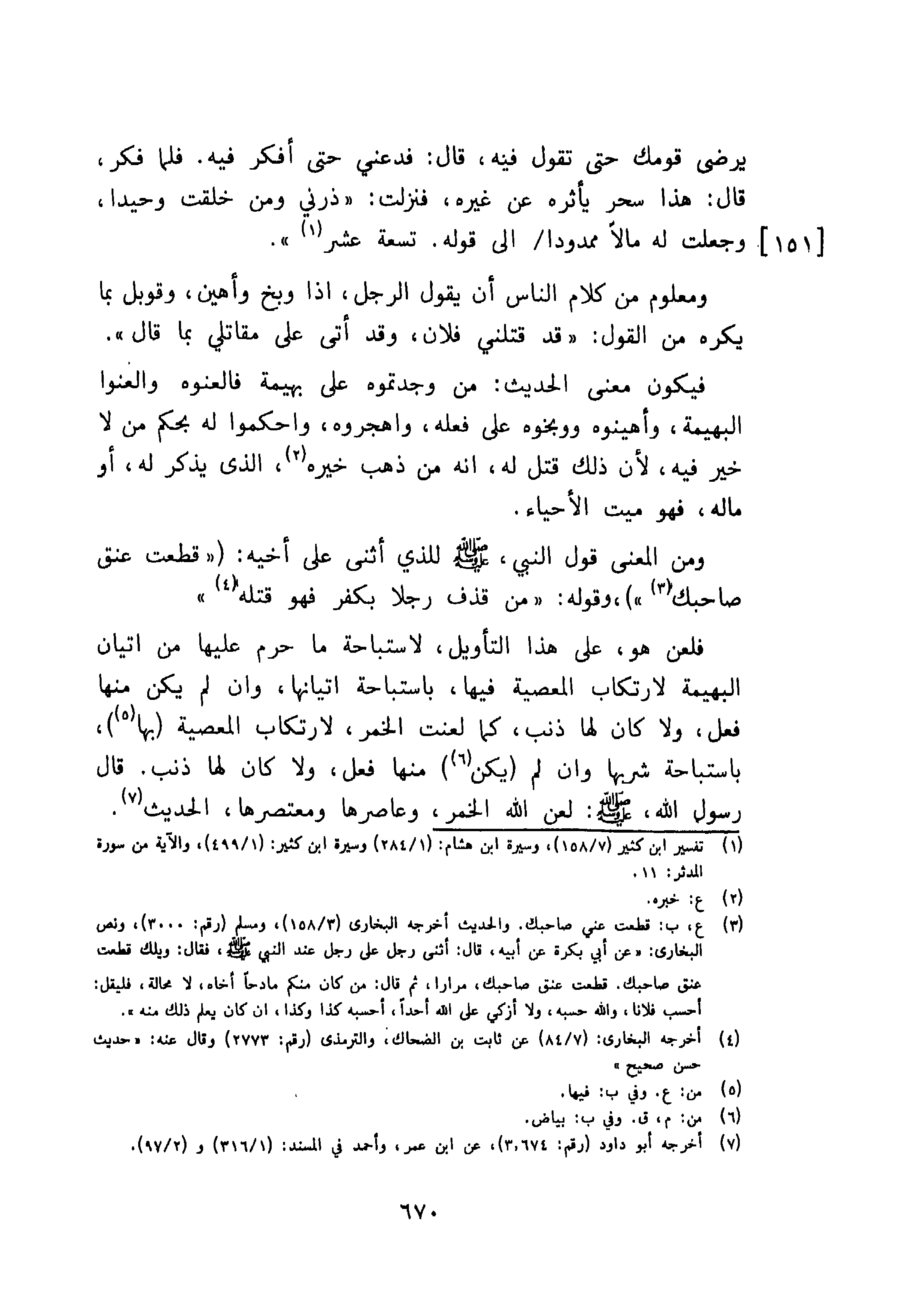 يرضى قومك حتى تقول فيه، قال: فدعنى حتى أفكر فيه. فلما فكر، قال: هذا سحر يأثره عن غيره، فنزلت: ذرني ومن خلقت وحيدا، وجعلت له مالا ممدودا / إلى قوله تسعة عشر.
