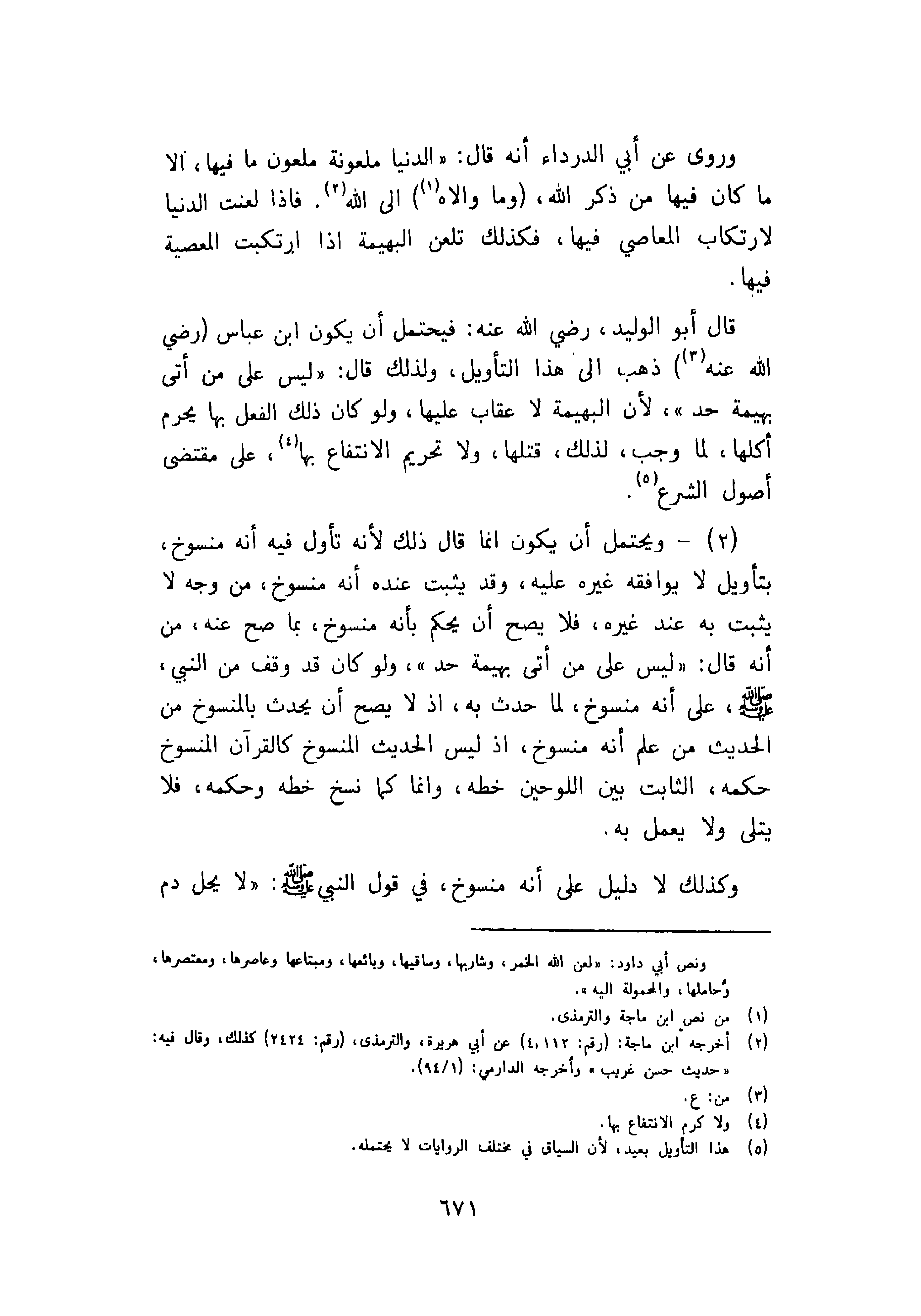 (2) - ويحتمل أن يكون انما قال ذلك لأنه تأول فيه أنه منسوخ، بتأويل لا يوافقه غيره عليه، وقد يثبت عنده أنه منسوخ، من وجه لا يثبت به عند غيره، فلا يصح أن يحكم بأنه منسوخ، بما صح عنه، من أنه قال ليس على من أتى بهيمة حد، ولو كان قد وقف من النبي، صلى الله عليه وسلم، على أنه منسوخ، لما حدث به، اذ لايصح أن يحدث بالمنسوخ من الحديث من علم أنه منسوخ، اذ ليس الحديث المنسوخ كالقرآن المنسوخ حكمه، الثابت بين اللوحين خطه، وانما كما نسخ خطه وحكمه، فلا يتلى ولا يعمل به.