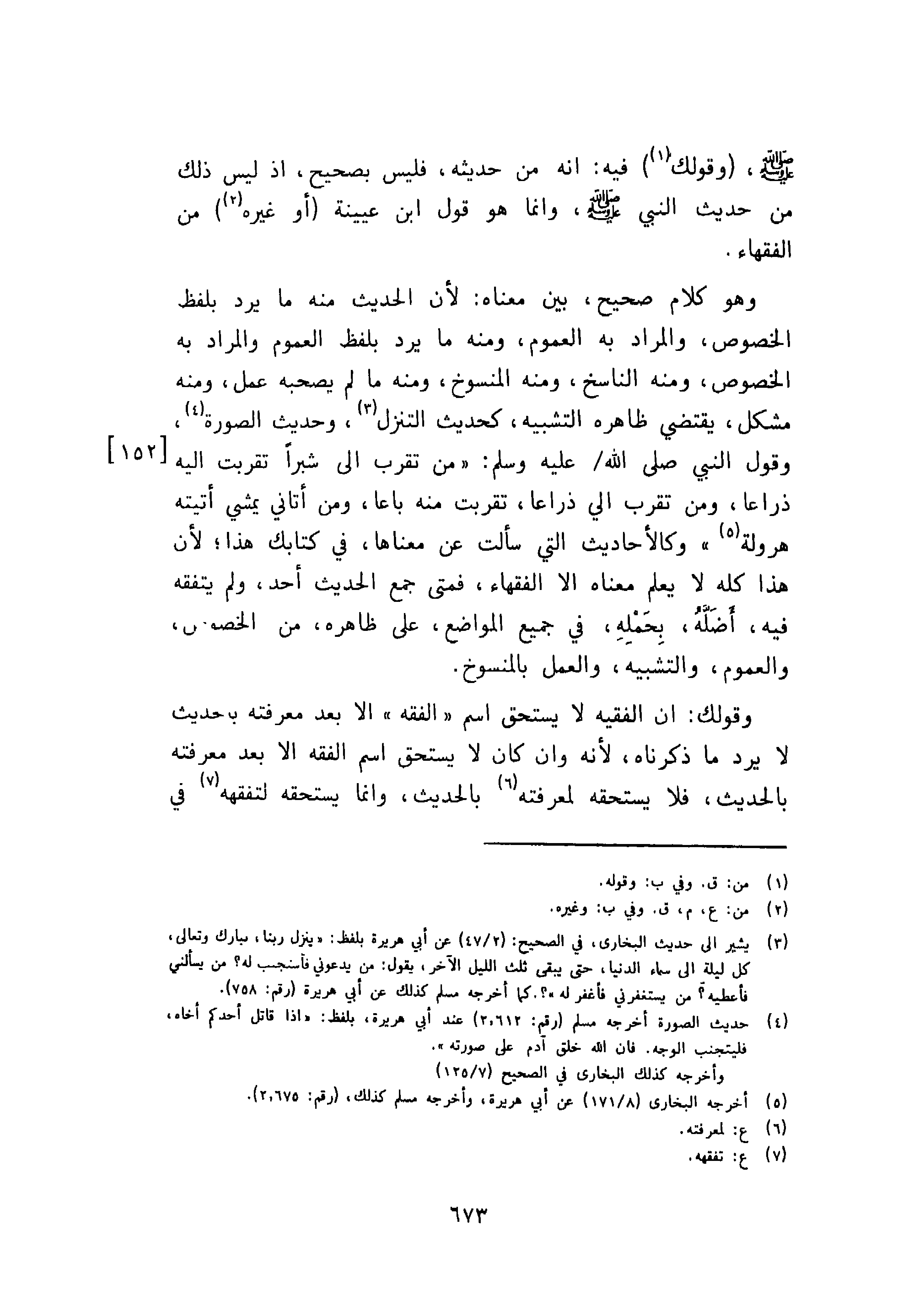 وهو كلام صحيح، بين معناه: لأن الحديث منه ما يرد بلفظ الخصوص، والمراد به العموم، ومنه ما يرد بلفظ العموم والمراد به الخصوص، ومنه الناسخ، ومنه المنسوخ، ومنه ما لم يصحبه عمل، ومنه مشكل، يقتضي ظاهره التشبيه، كحديث التنزل، وحديث الصورة، وقول النبي صلى الله عليه وسلم {من تقرب إلى شبرا تقربت اليه ذراعا، ومن تقرب إلى ذراعا، تقربت منه باعا، ومن أتاني يمشى أتيته هرولة} وكالأحاديث التي سألت عن معناها، في كتابك هذا؛ لأن هذا كله لا يعلم معناه الا الفقهاء، فمتى جمع الحديث أحد، ولم يتفقه فيه، اضله، بحمله، في جميع المواضع، على ظاهره، من الخصوص، والعموم، والتشبيه، والعمل بالمنسوخ.
