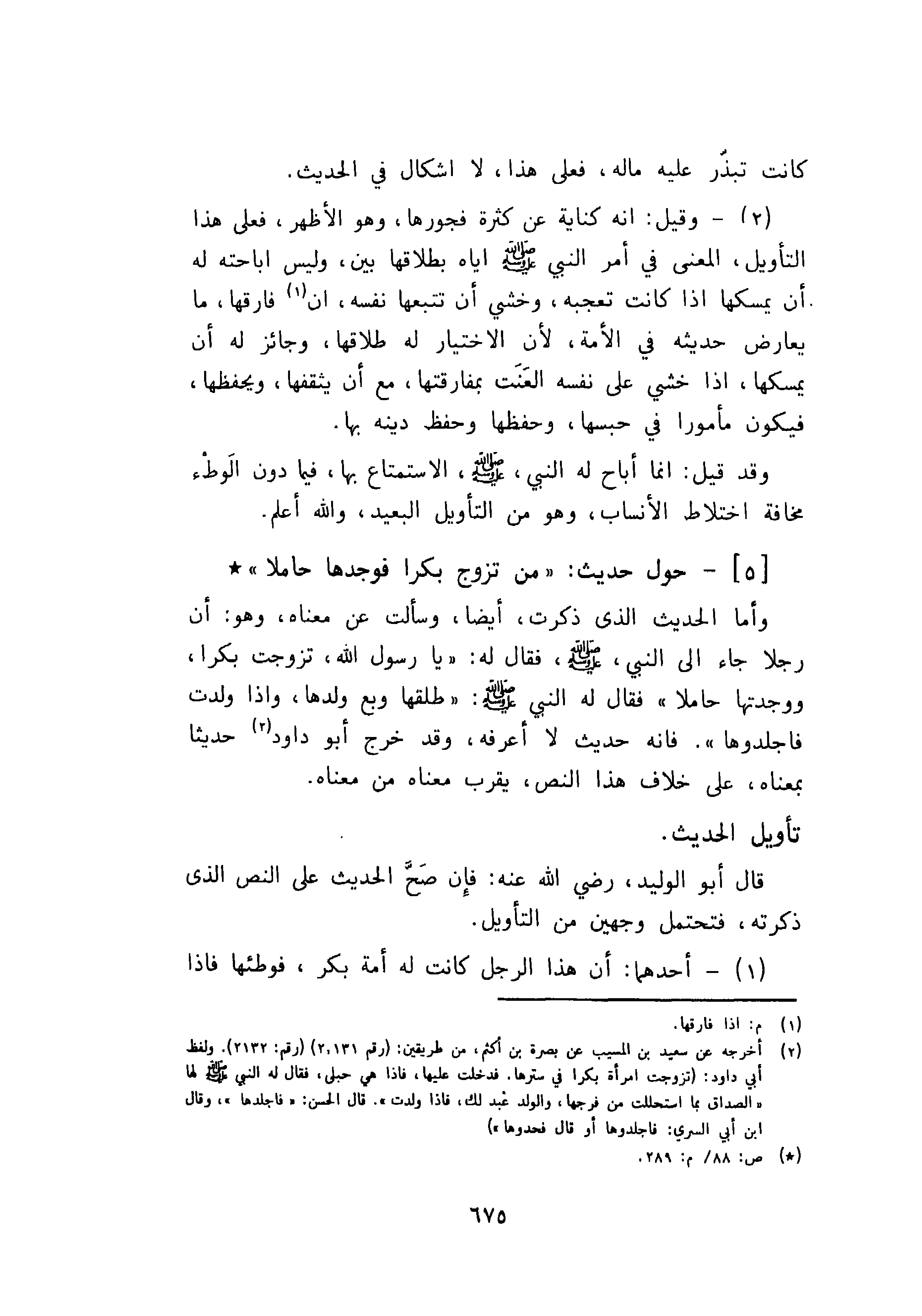 وأما الحديث الذى ذكرت، أيضا، وسألت عن معناه، وهو: أن رجلا جاء إلى النبي صلى الله عليه وسلم فقال له: «يا رسول الله، تزوجت بكرا، ووجدتها حاملا» فقال له النبي صلى الله عليه وسلم: «طلقها وبع ولدها، واذا ولدت فاجلدها». فانه حديث لا أعرفه، وقد خرج أبو داود حديثا بمعناه، على خلاف هذا النص، يقرب معناه من معناه.