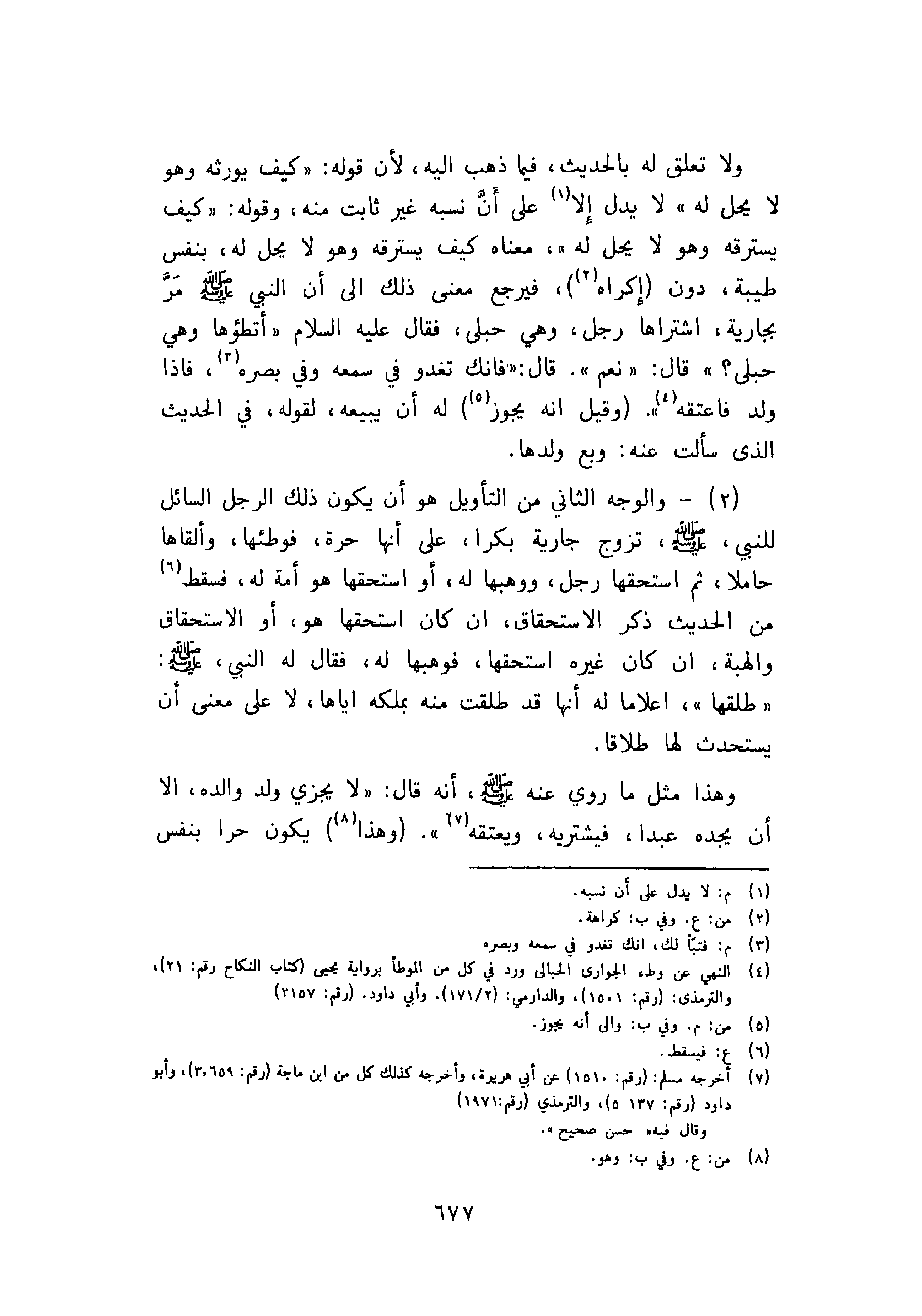 ولا تعلق بالحديث، فيما ذهب اليه، لأن قوله: «كيف يورثه وهو لا يحل له» لا يدل إلا على ان نسبه غير ثابت منه، وقوله: «كيف يسترقه وهو لا يحل له»، معناه كيف يسترقه وهو لا يحل له، بنفس طيبة، دون إكراه، فيرجع معنى ذلك إلى أن النبي صلى الله عليه وسلم مر بجارية، اشتراها رجل، وهى حبلى، فقال عليه السلام «أتطؤها وهى حبلى؟» قال: «نعم». قال: «فانك تغدو في سمعه وفي بصره، فاذا ولد فاعتقه». وقيل انه يجوز له أن يبيعه، لقوله، في الحديث الذى سألت عنه: وبع ولدها.