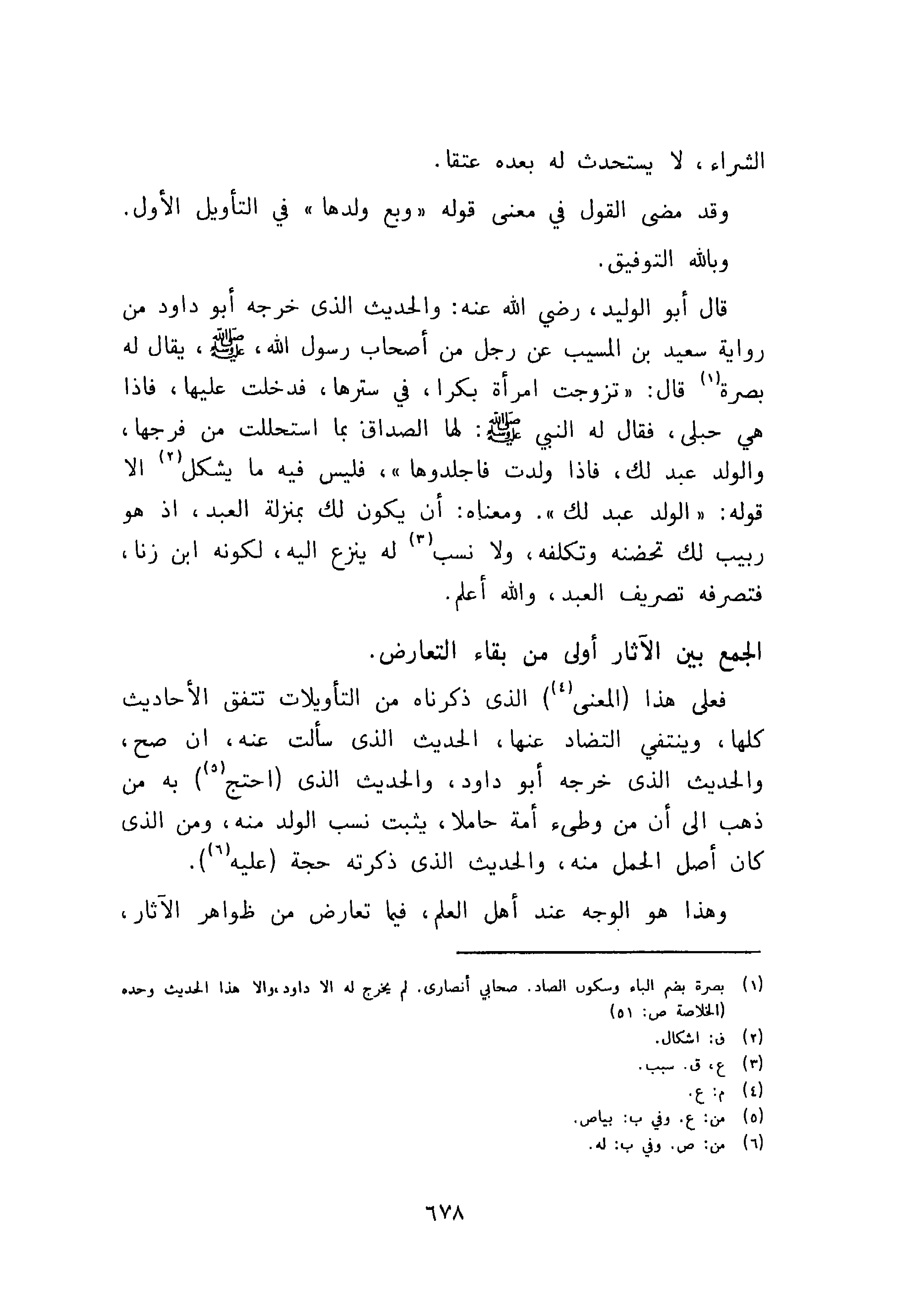 قال أبو الوليد، رضي الله عنه: والحديث الذى خرجه أبو داود من رواية سعيد بن المسيب عن رجل من أصحاب رسول الله صلى الله عليه وسلم، يقال له بصرة قال: «تزوجت امرأة بكرا، في سترها، فدخلت عليها، فاذا هى حبلى، فقال له النبي صلى الله عليه وسلم: لها الصداق بما استحللت من فرجها، والولد عبد لك، فاذا ولدت فاجلدوها»، فليس فيه ما يشكل الا قوله: «الولد عبد لك». ومعناه: أن يكون لك بمنزلة العبد، اذ هو ربيب لك تحضنه وتكلفه، ولا نسب له ينزع اليه، لكونه ابن زنا، فتصرفه تصريف العبد، والله أعلم.
