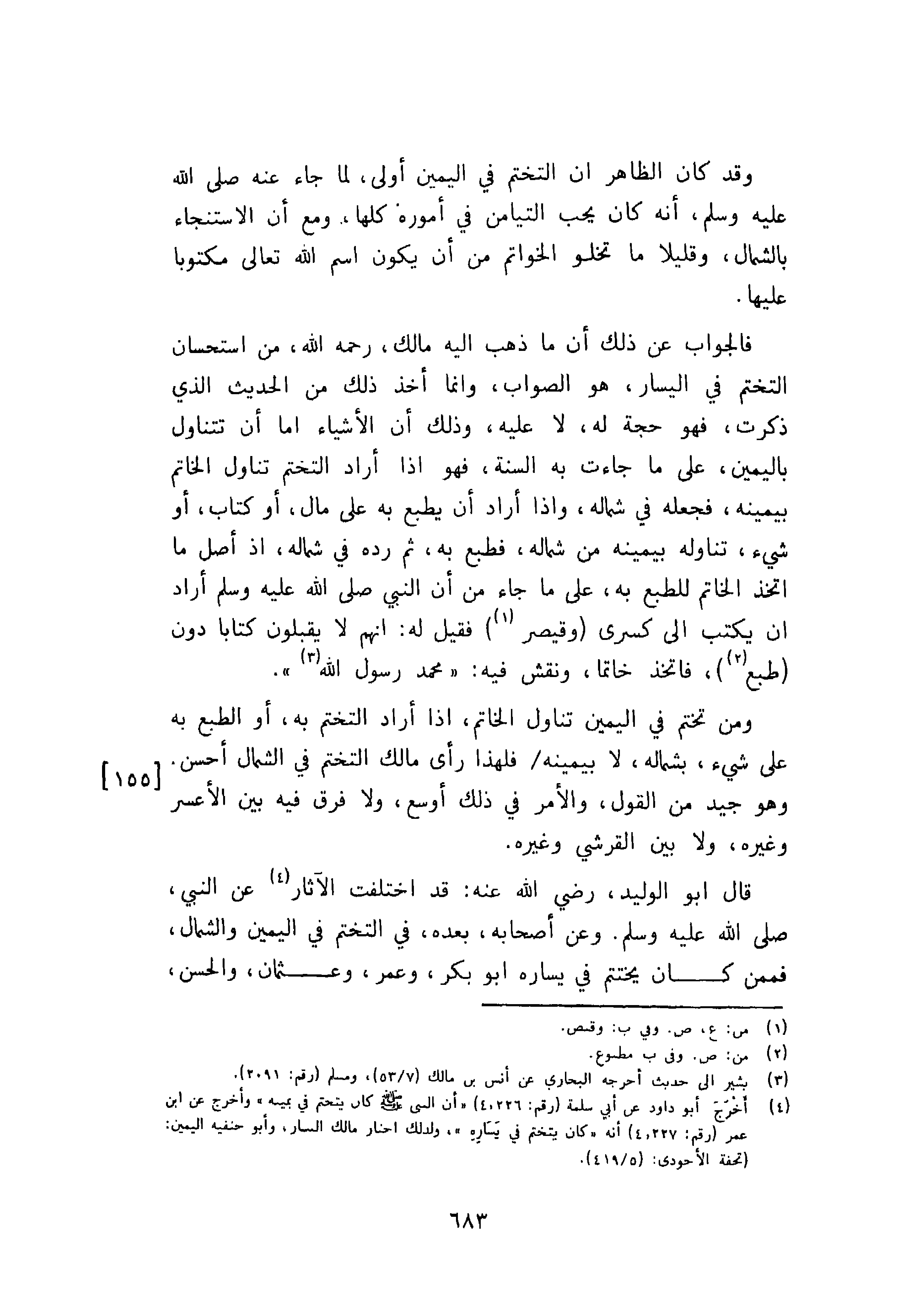 فالجواب عن ذلك أن ذهب اليه مالك، رحمه الله، من استحسان التختم في اليسار، هو الصواب، وانما أخذ ذلك من الحديث الذي ذكرت، فهو حجة له، لا عليه، وذلك أن الاشياء اما أن تتناول باليمين على ما جاءت به السنة فهو إذا أراد التختم تناول الخاتم بيمينه، فجعله في شماله، واذا أراد أن يطبع به على مال، أو كتاب أو شيء، تناوله بيمينه من شماله، فطبع به ثم رده في شماله، اذ أصل ما اتخذ الخاتم للطبع به، على ما جاء من أن النبي صلى الله عليه وسلم أراد ان يكتب إلى كسرى وقيصر فقيل له: انهم لا يقبلون كتابا دون طبع، فاتخذ خاتما، ونقش فيه: