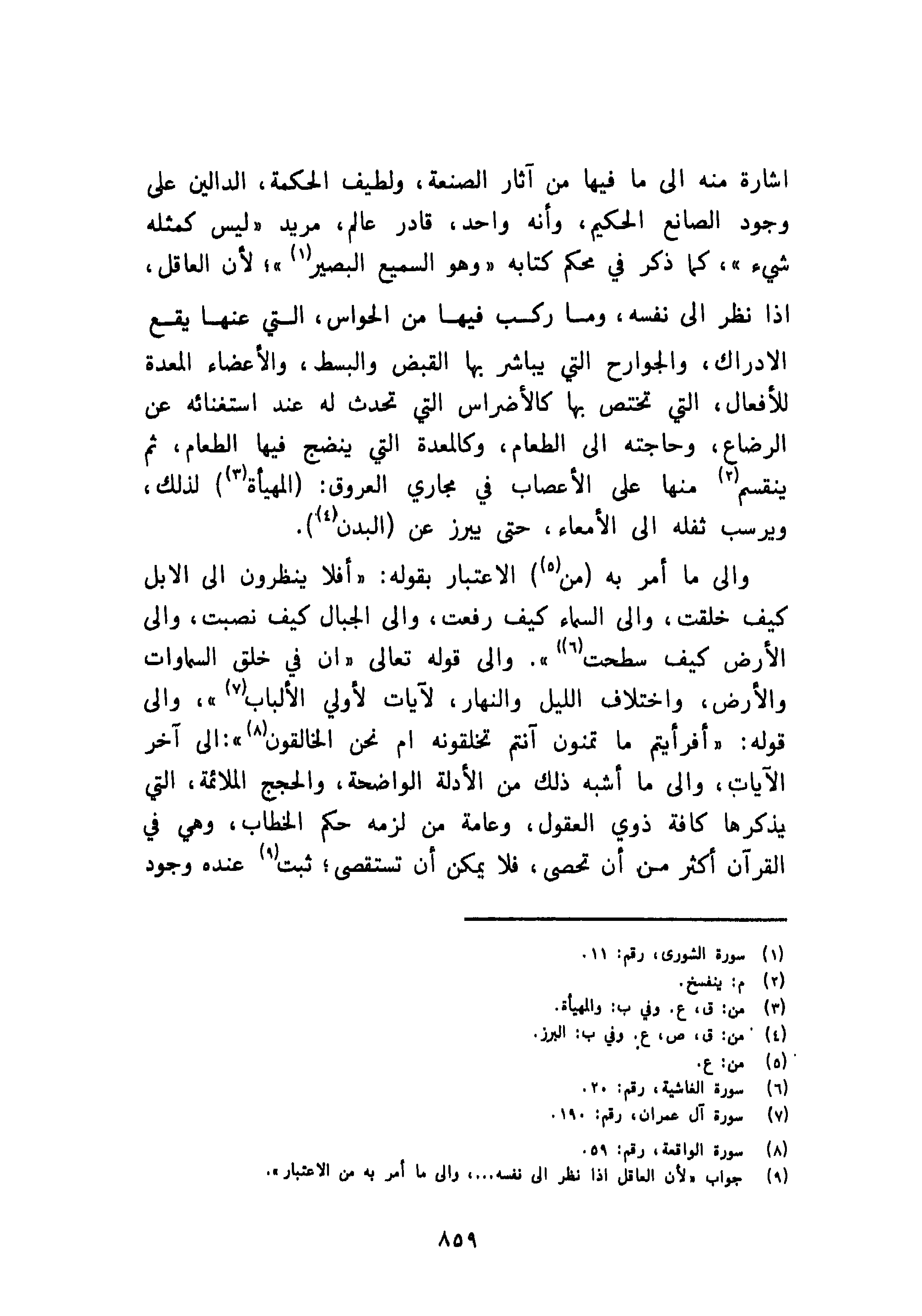 إلى آخر الآيات والى ما أشبه ذلك من الأدلة الواضحة والحجج الملائمة التي يذكرها كافة ذوي العقول وعامة من لزمه حكم الخطاب وهي في القرآن أكثر من أن تحصى، فلا يمكن أن تستقصى؛ ثبت عنده وجود
