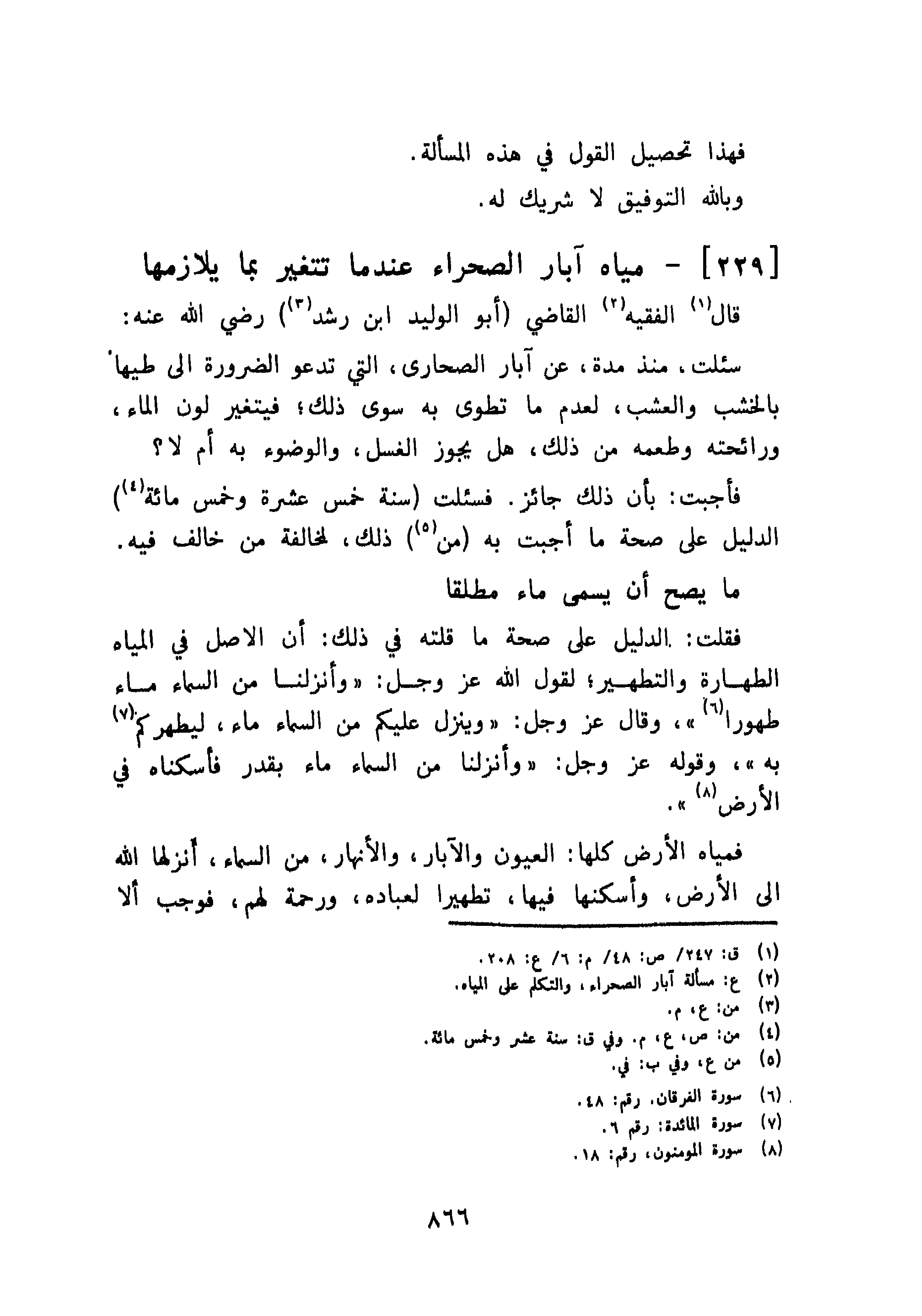 فقلت: الدليل على صحة ما قلته في ذلك: أن الاصل في المياه الطهارة والتطهير؛ لقول الله عز وجل: {وأنزلناه من السماء ماء طهورا}