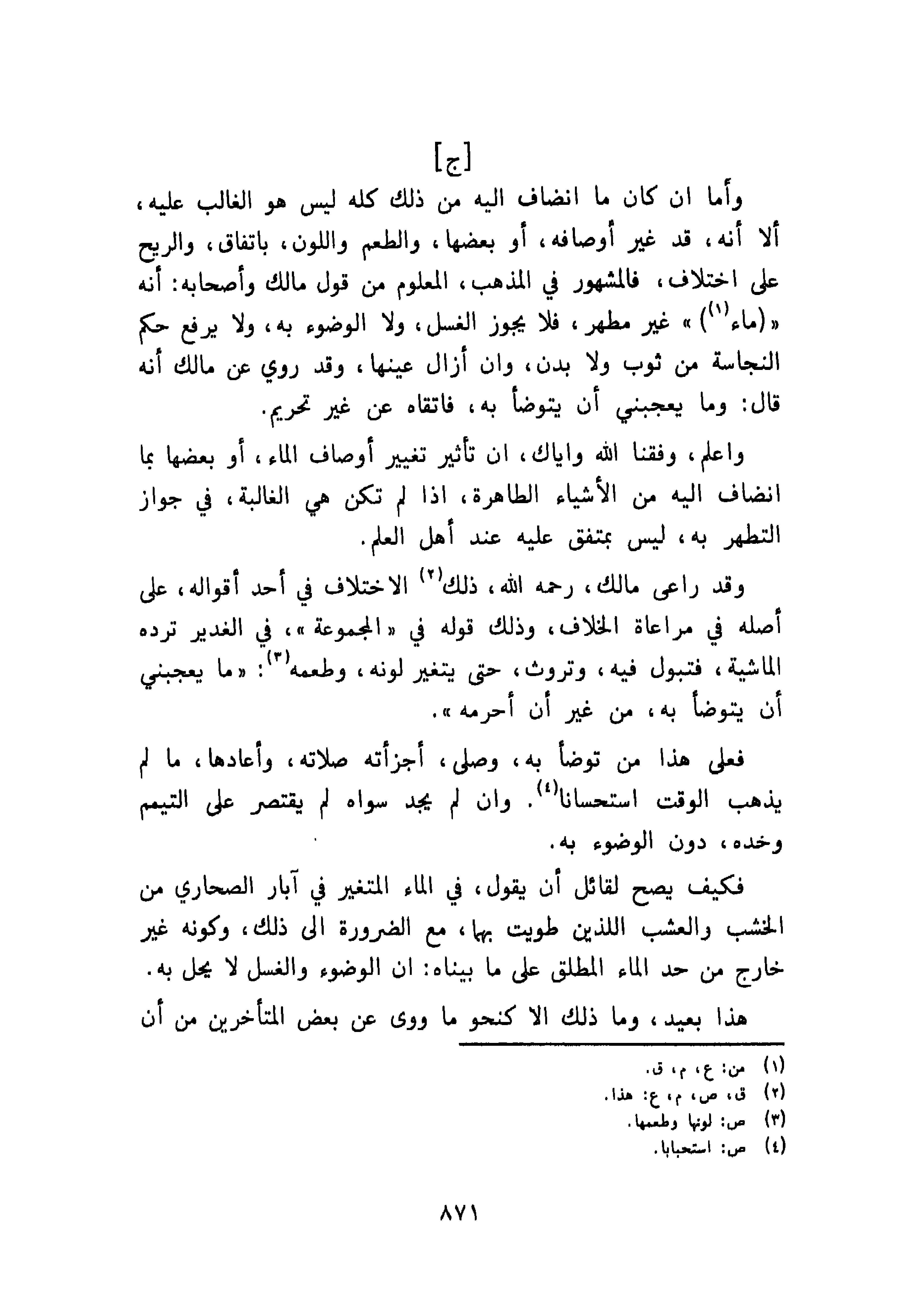 وأما ان كان ما انضاف اليه من ذلك كله ليس هو الغالب عليه، ألا انه، قد غير أوصافه، أو بعضها، والطعم واللون، باتفاق، والريح على اختلاف، فالمشهور في المذهب، المعلوم من قول مالك وأصحابه: أنه ماء غير مطهر، فلا يجوز الغسل، ولا الوضوء به، ولا يرفع حكم النجاسة من ثوب ولا بدن، وان أزال عينها، وقد روي عن مالك أنه قال: وما يعجبنى أن يتوضأ به، فاتقاه عن غير تحريم.
