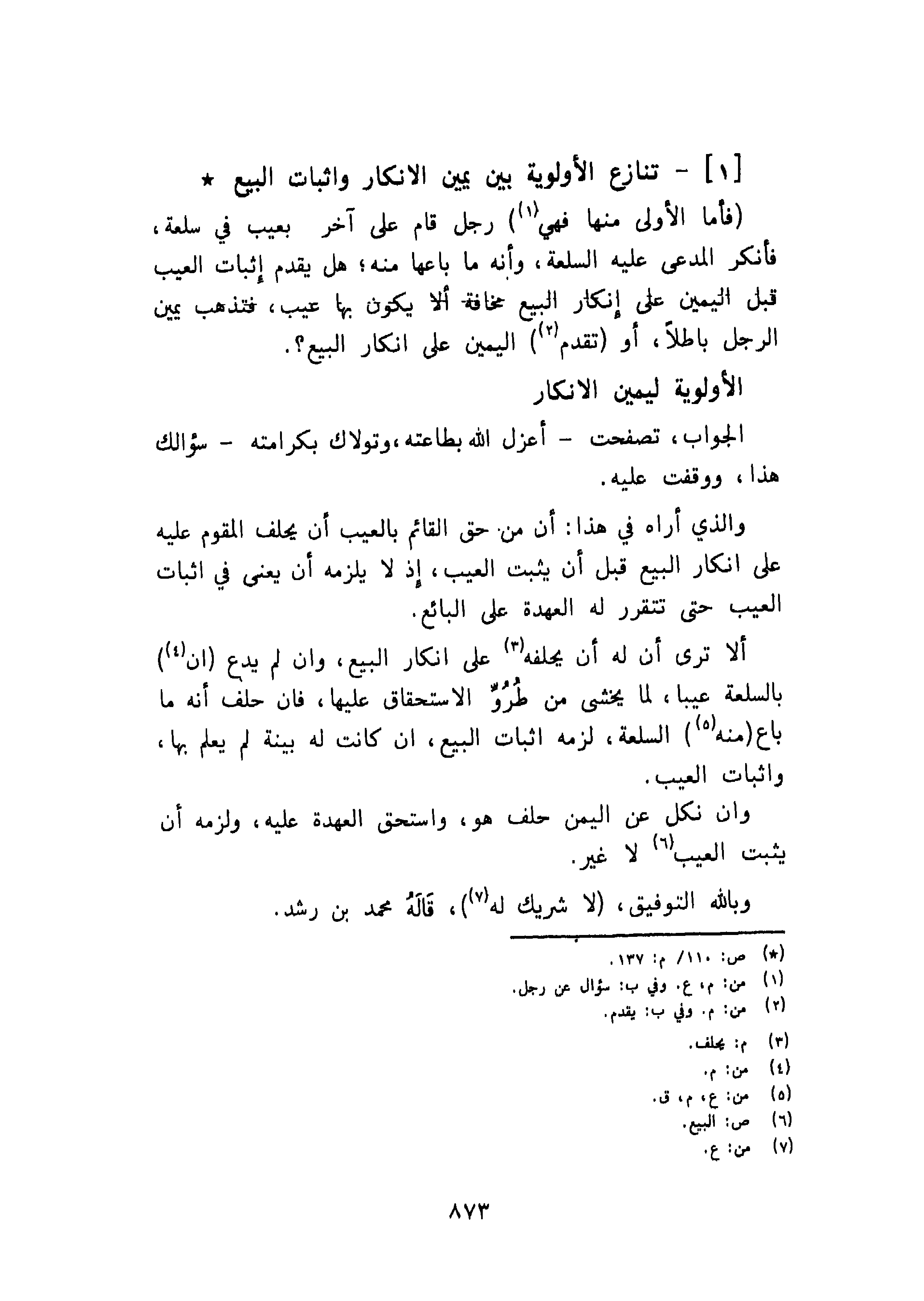فأما الأولى منها فهي رجل قام على آخر بعيب في سلعة، فأنكر المدعي عليه السلعة، وأنه ما باعها منه؛ هل يقدم إثبات العيب قبل اليمين على انكر البيع مخافة ألا يكون بها عيب، فتذهب يمين الرجل باطلا، أو تقدم اليمين على انكار البيع؟
