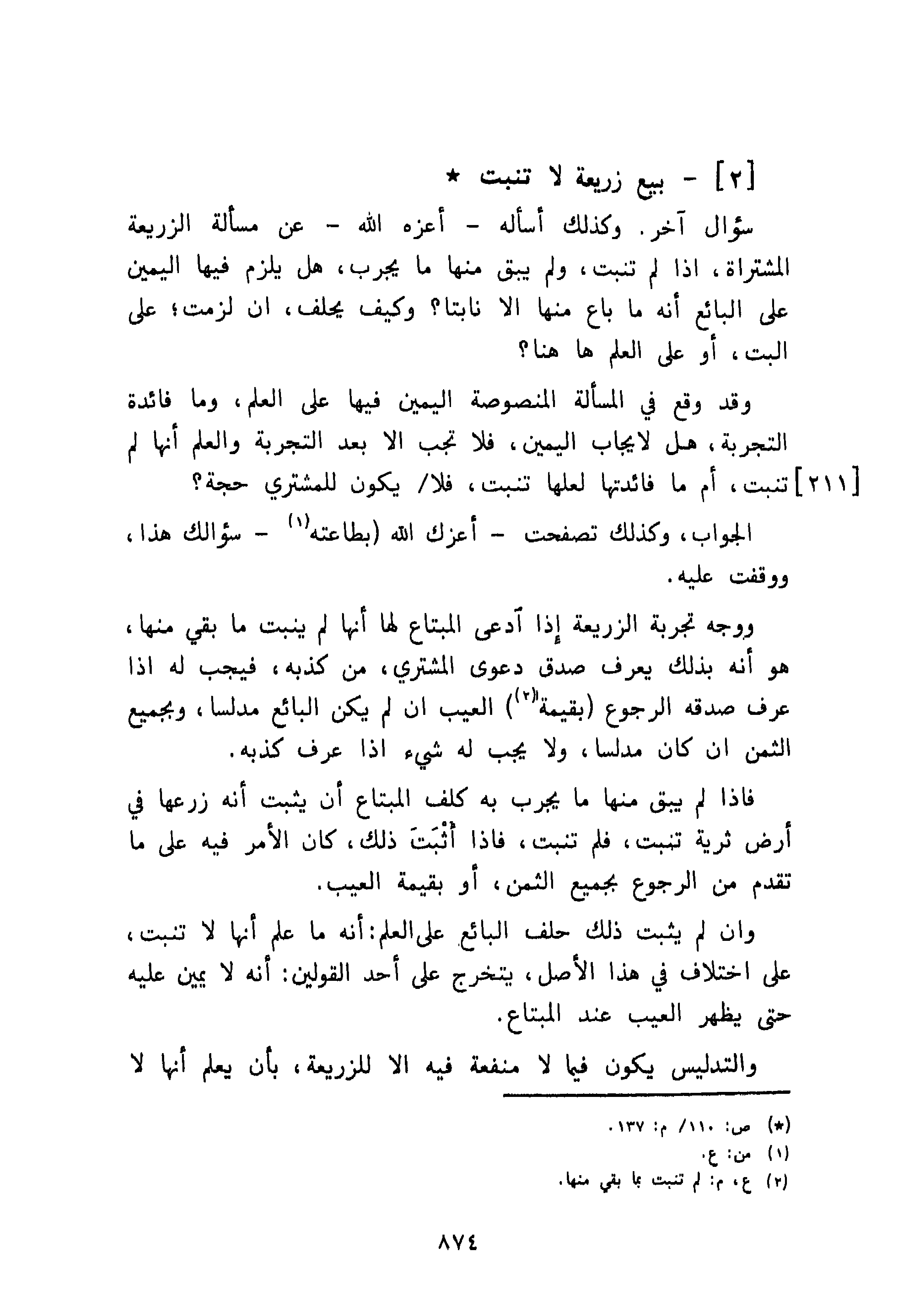 سؤال آخر. وكذلك أسأله - أعزه الله - عن مسألة الزريعة المشتراة، إذا لم تنبت، ولم يبق منها مايجرب، هل يلزم فيها اليمين على البائع أنه ما باع منها الا نابتا؟ وكيف يحلف، ان لزمت؛ على البت، أو على العلم ها هنا؟
