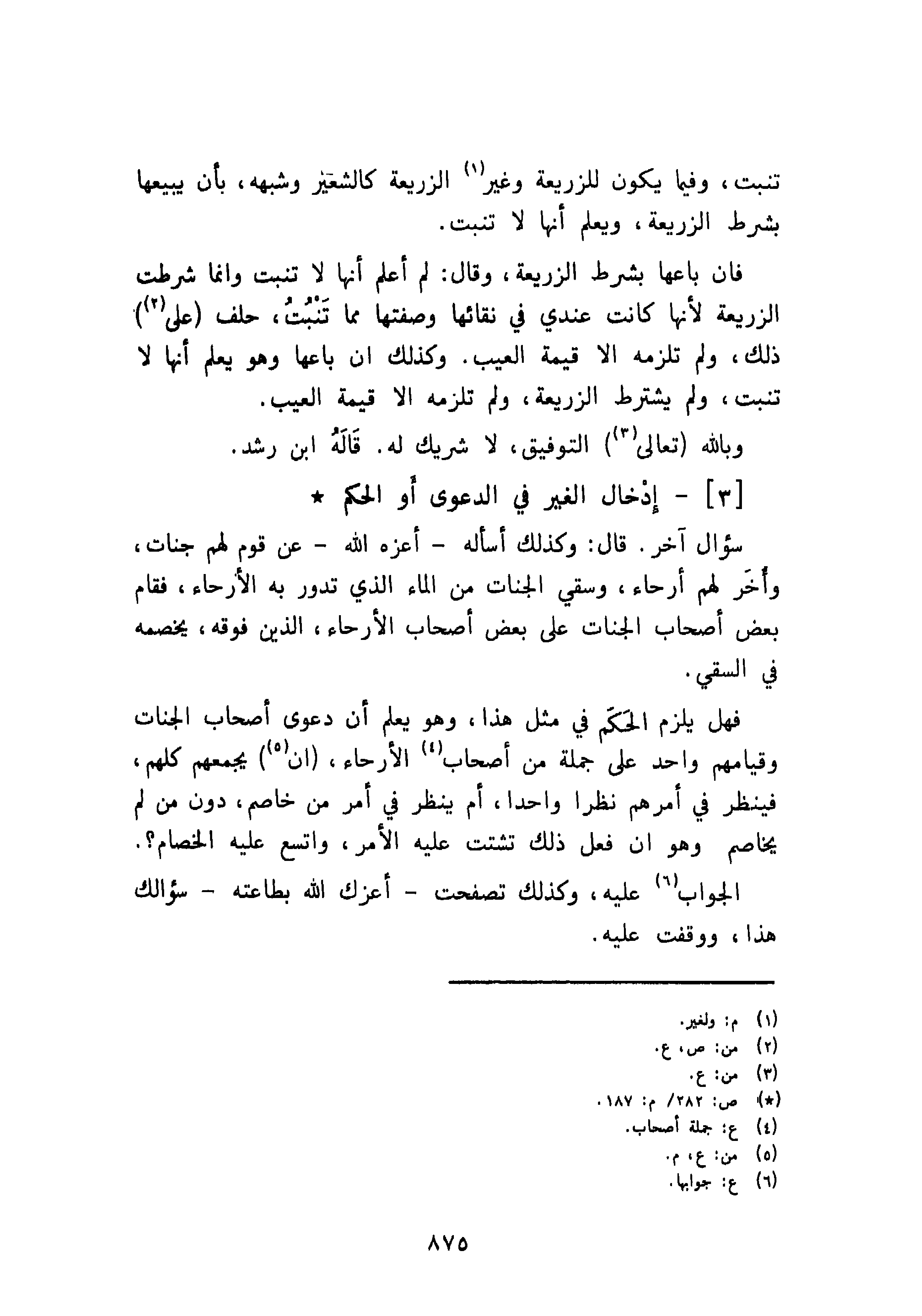 سؤال آخر. قال: وكذلك أساله - أعزه الله - عن قوم لهم جنات، وأخر لهم أرحاء، وسقي الجنات من الماء الذي تدور به الأرحام، فقام بعض أصحاب الجنات على بعض أصحاب الأرحاء، الذين فوقه، يخصمه في السقي.