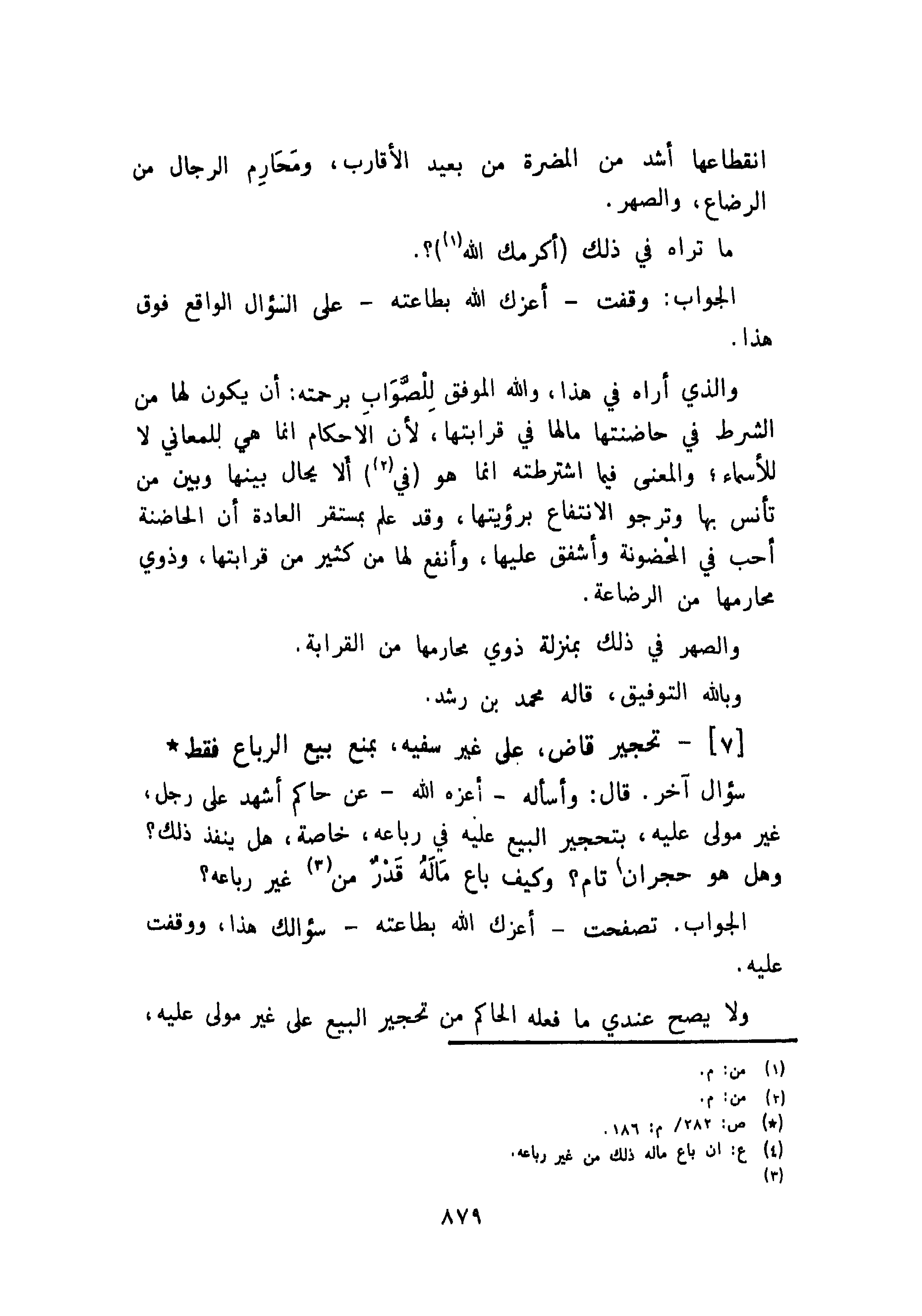 سؤال آخر. قال: وأسأله - أعزه الله - حاكم أشهد على رجل، غير مولى عليه، بتحجير البيع عليه في رباعه، خاصة، هل ينفذ ذلك؟