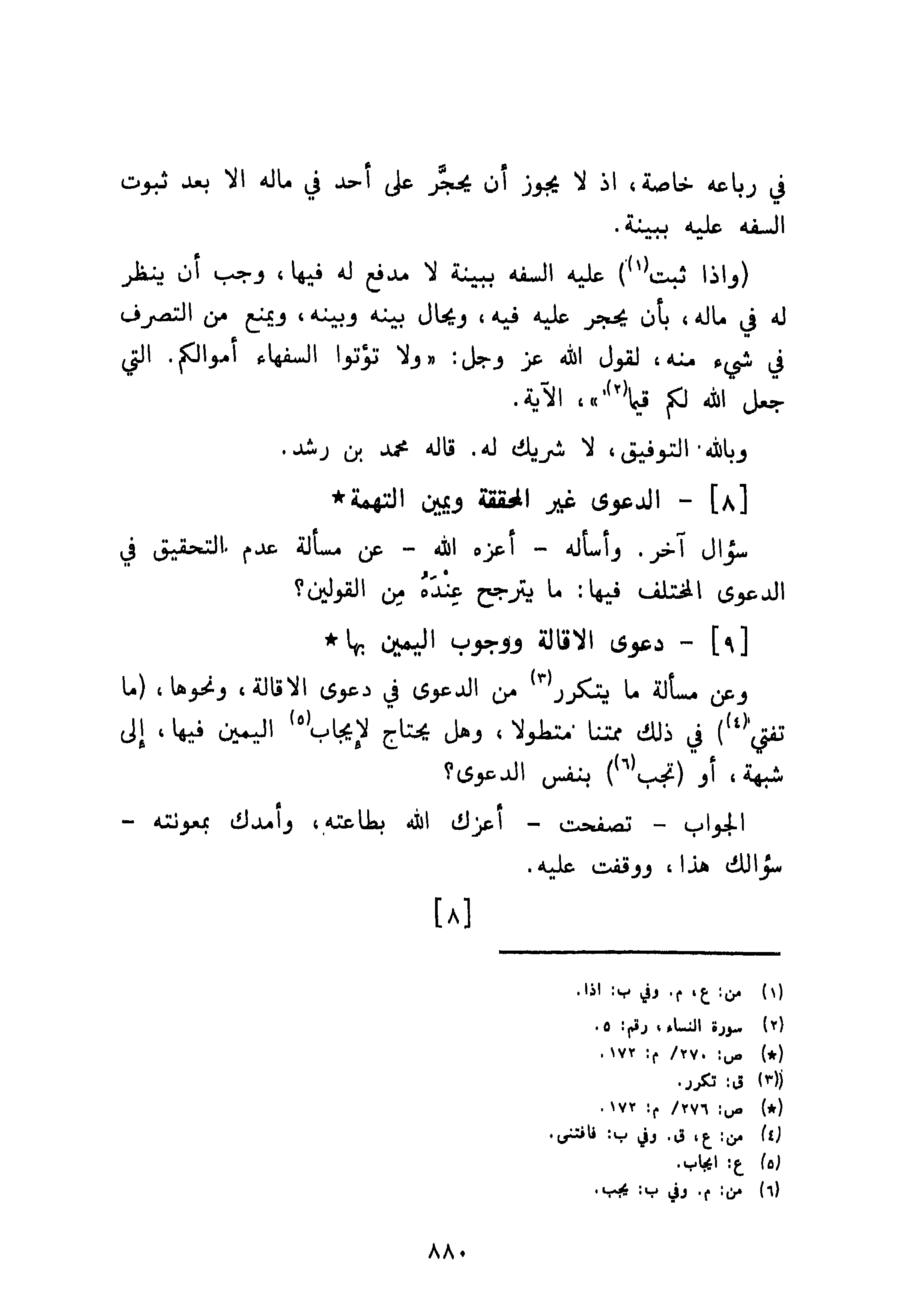 واذا ثبت عليه السفه ببينة لا مدفع له فيها، وجب أن ينظر له في ماله، بأن يحجر عليه فيه، ويحال بينه وبينه، ويمنع من التصرف في شىء منه، لقول اللهخ تعالى عز وجل {وَلَا تُؤْتُوا السُّفَهَاءَ أَمْوَالَكُمُ الَّتِي جَعَلَ اللَّهُ لَكُمْ قِيَامًا}