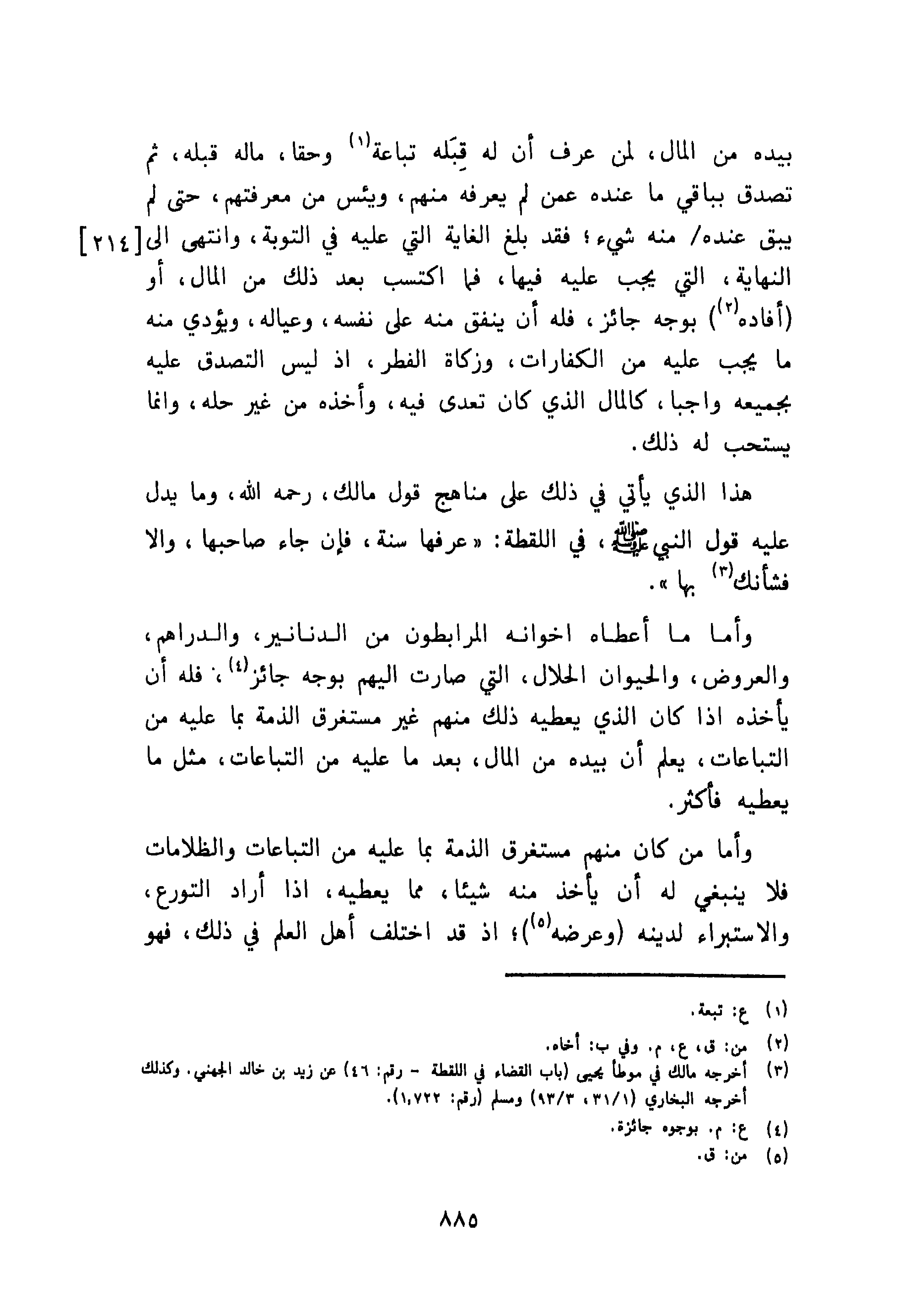 واما ما أعطاه اخوانه المرابطون من الدنانير والدراهم والعروض والحيوان الحلال، التي صارت اليهم بوجبه جائز فله ان ياخذه إذا كان الذي يعطيه ذلك منهم غير مستغرق الذمة بما عليه من التباعات، يعلم ان بيده من المال، بعد ما عليه من التباعات، مثل ما يعطيه فأكثر.