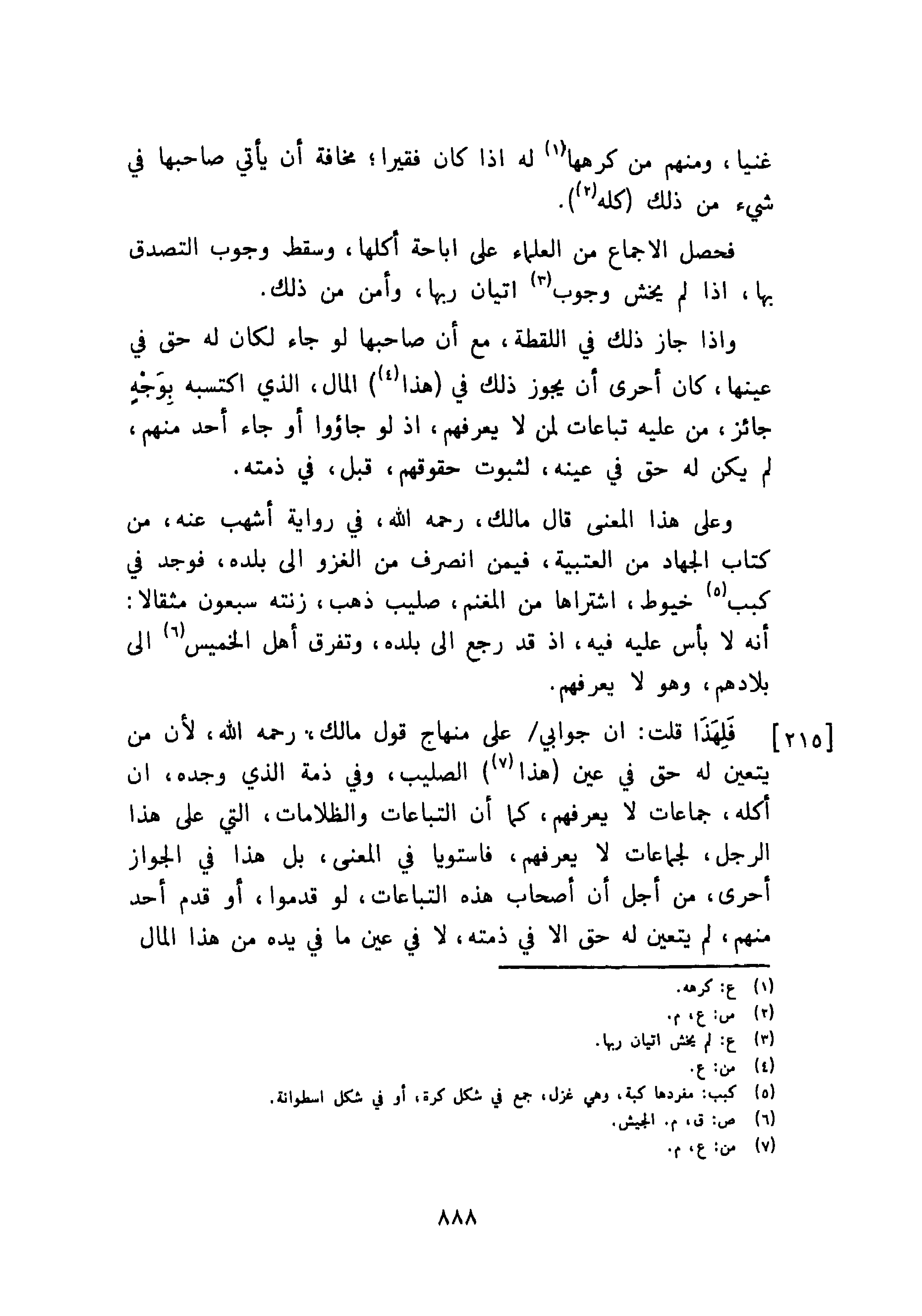 [215] فلهذا قلت: ان جوابي على منهاج قول مالك، رحمه الله، لأن من يتعين له حق في عين هذا الصليب، وفي ذمة الذي وجده، ان اكله، جماعات لا يعرفهم كما أن التباعات والظلامات، التي على هذا الرجل لجماعات لا يعرفهم فاستويا في المعنى، بل هذا في الجواز أحرى من اجل أن أصحاب هذه التباعات، لو قدموا، أو قدم أحد منهم، لم يتعين له حق الا في ذمته، لا في عين ما في يده من هذا المال