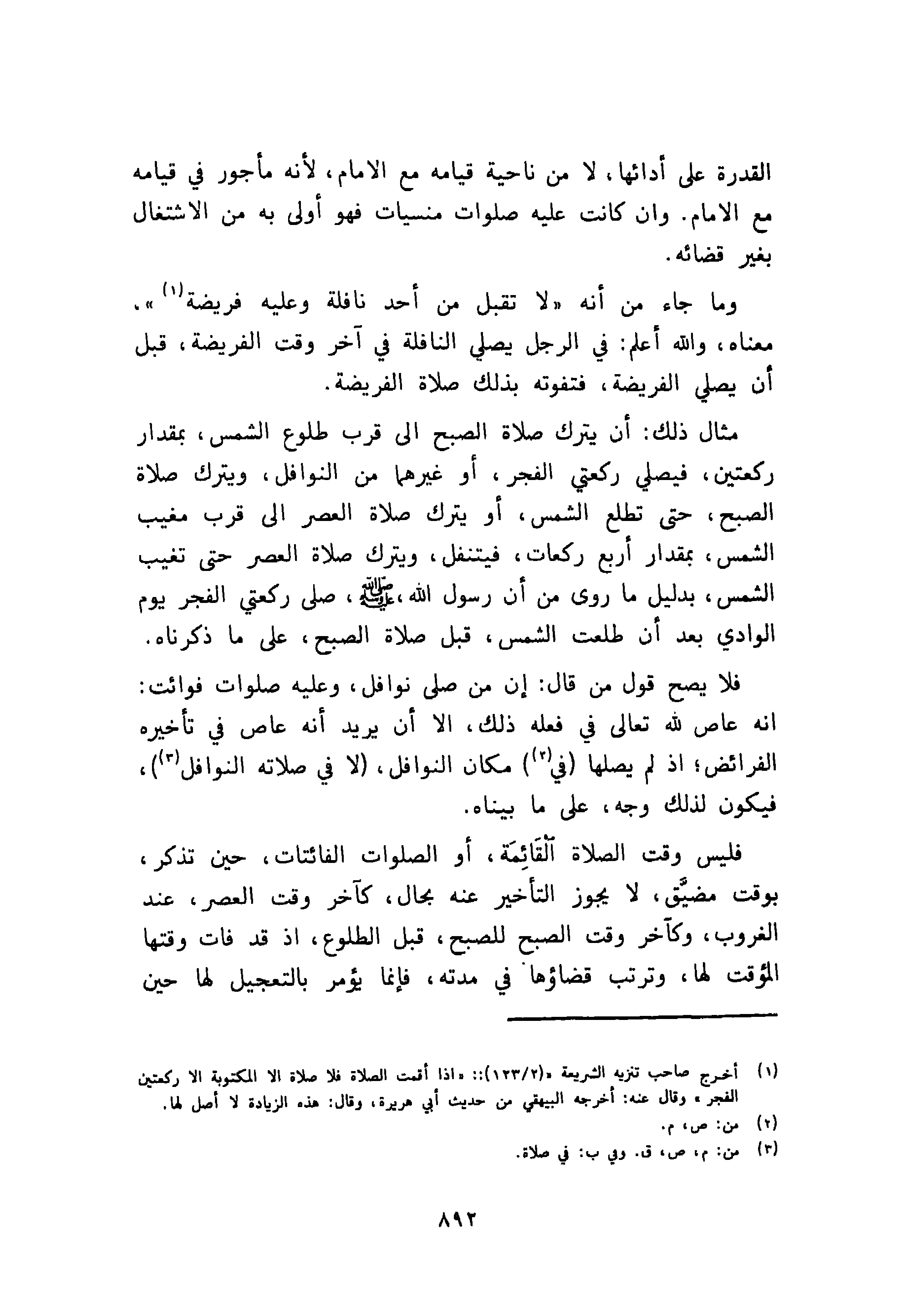 القدرة على أدائها، لا من ناحية قيامه مع الإمام، لأنه مأجورا في قيامه مع الإمام وان كانت عليه صلوات منسيات فهو ألأولى به من الاشتغال بغير قضائه.