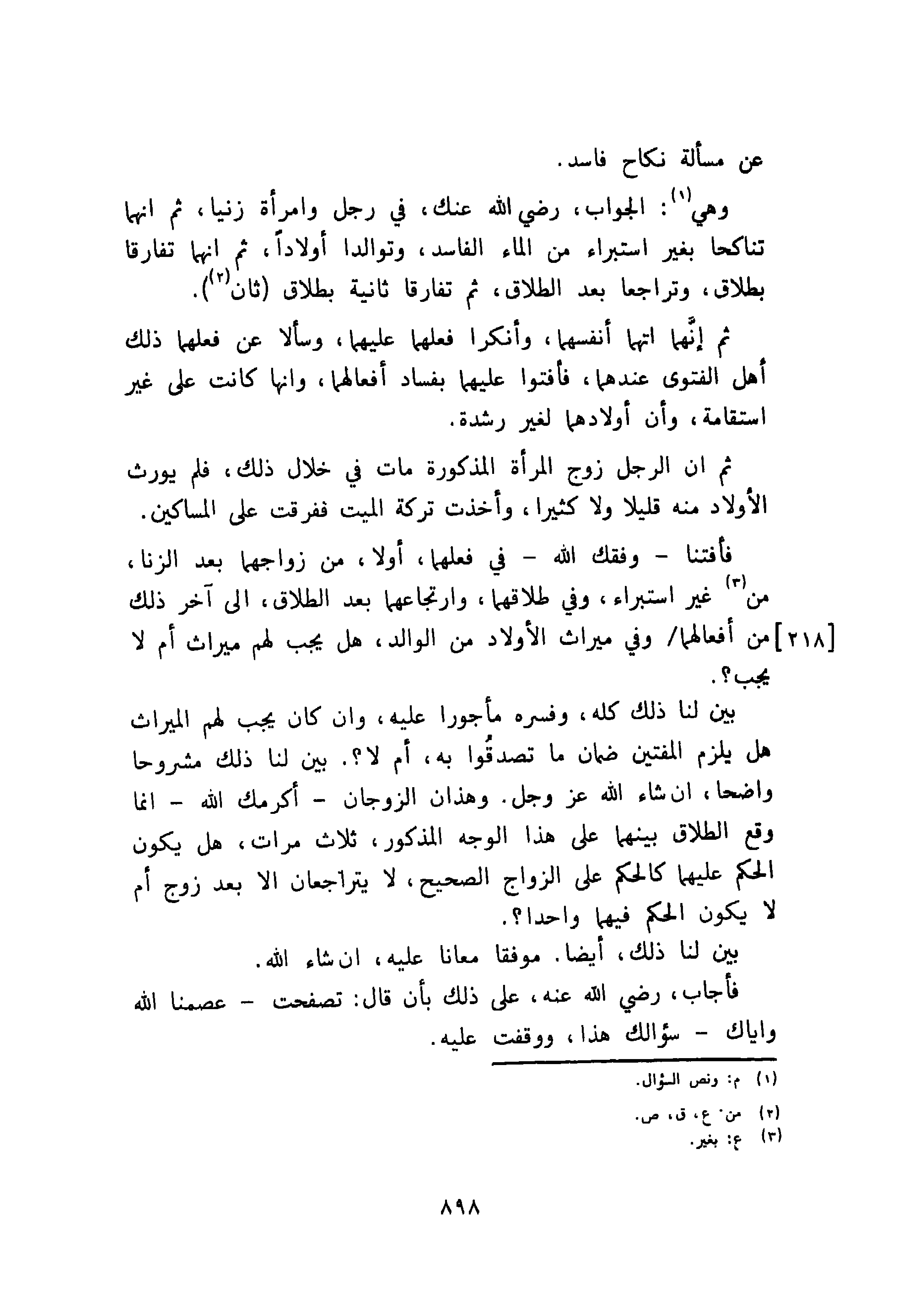 وهي: الجواب، رضي الله عنك، في رجل وامرأة زنيا، ثم انهما تناكحا بغير استبراء من الماء الفاسد، وتوالدا أولاداُ، ثم انهما تفارقا بطلاق، وتراجعا بعد الطلاق، ثم تفارقا ثانية بطلاق ثان.