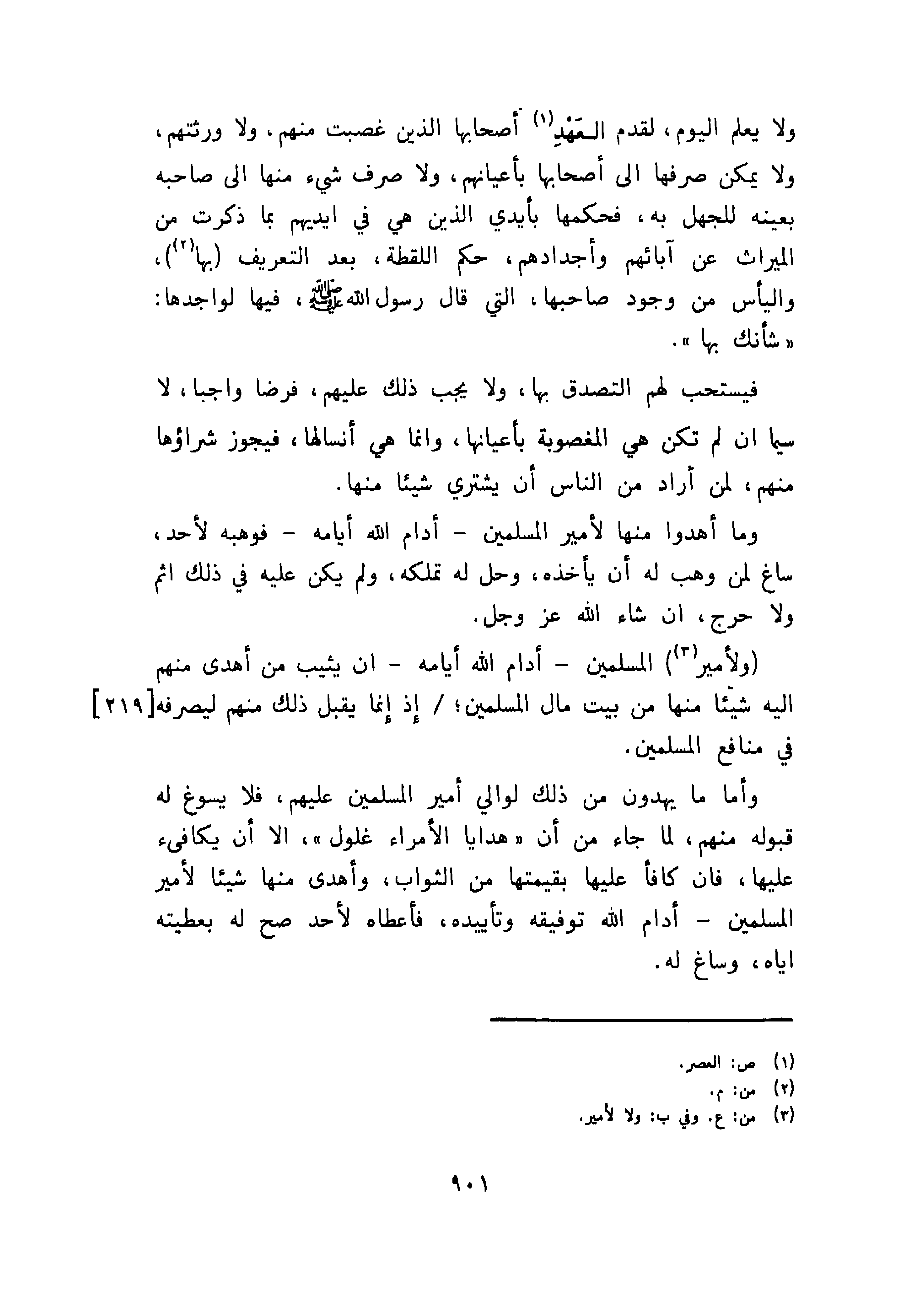 ولأمير المسلمين - أدام الله أيامه - ان يثبت من أهدى منهم اليه شيئاً منها من بيت مال المسلمين؛ / إذ إنما يقبل ذلك منهم ليصرفه [219] في منافع المسلمين.