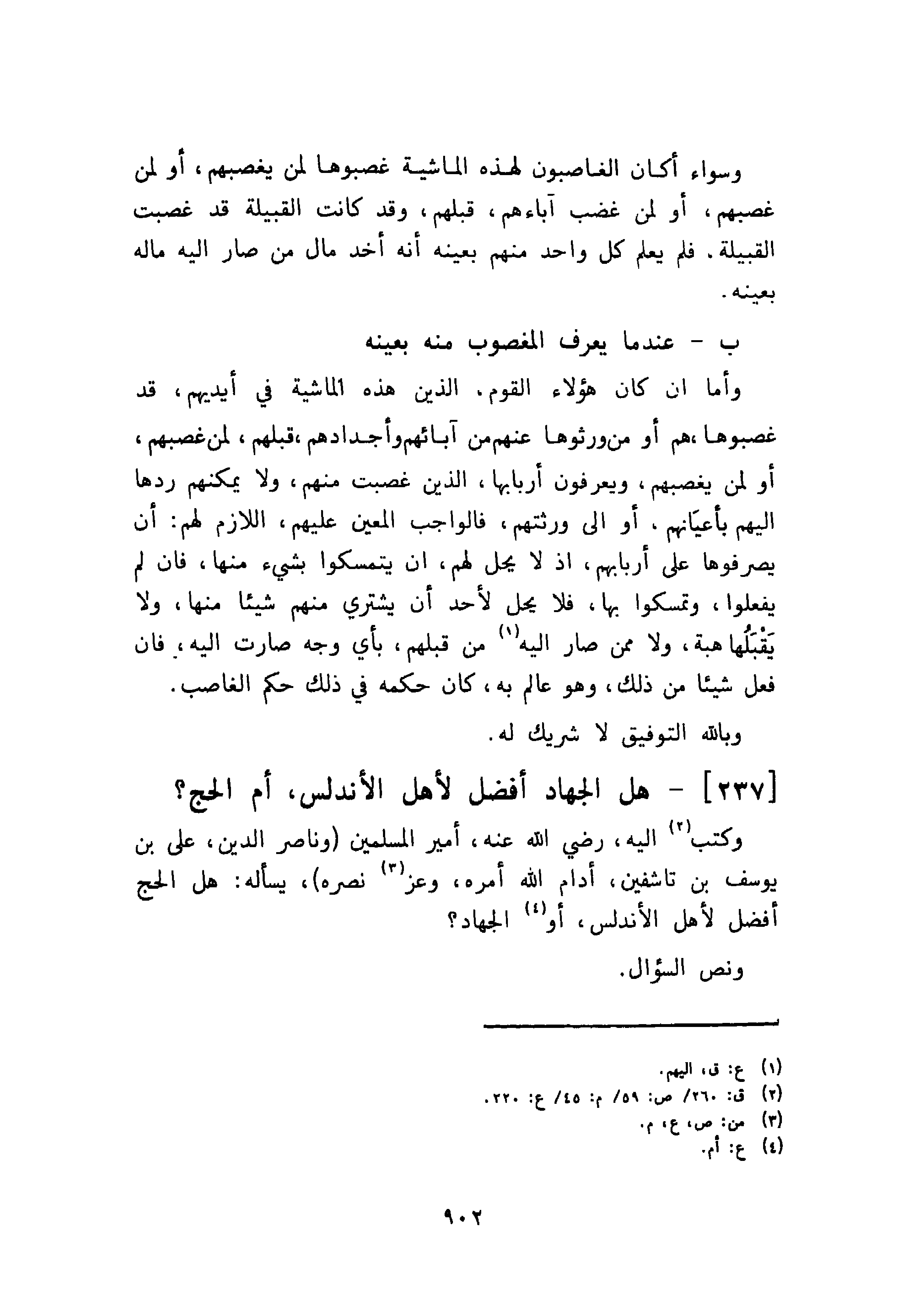 وسواء أكان الغاصبون لهذه الماشية غصبوها لمن يغصبهم، أو لمن غصبهم، أولمن غصب أباءهم، قبلهم، وقد كانت القبيلة قد غصبت القبيلة، فلم يعلم كل واحد منهم بعينه أنه أخذ مال من صار اليه ماله بعينه.