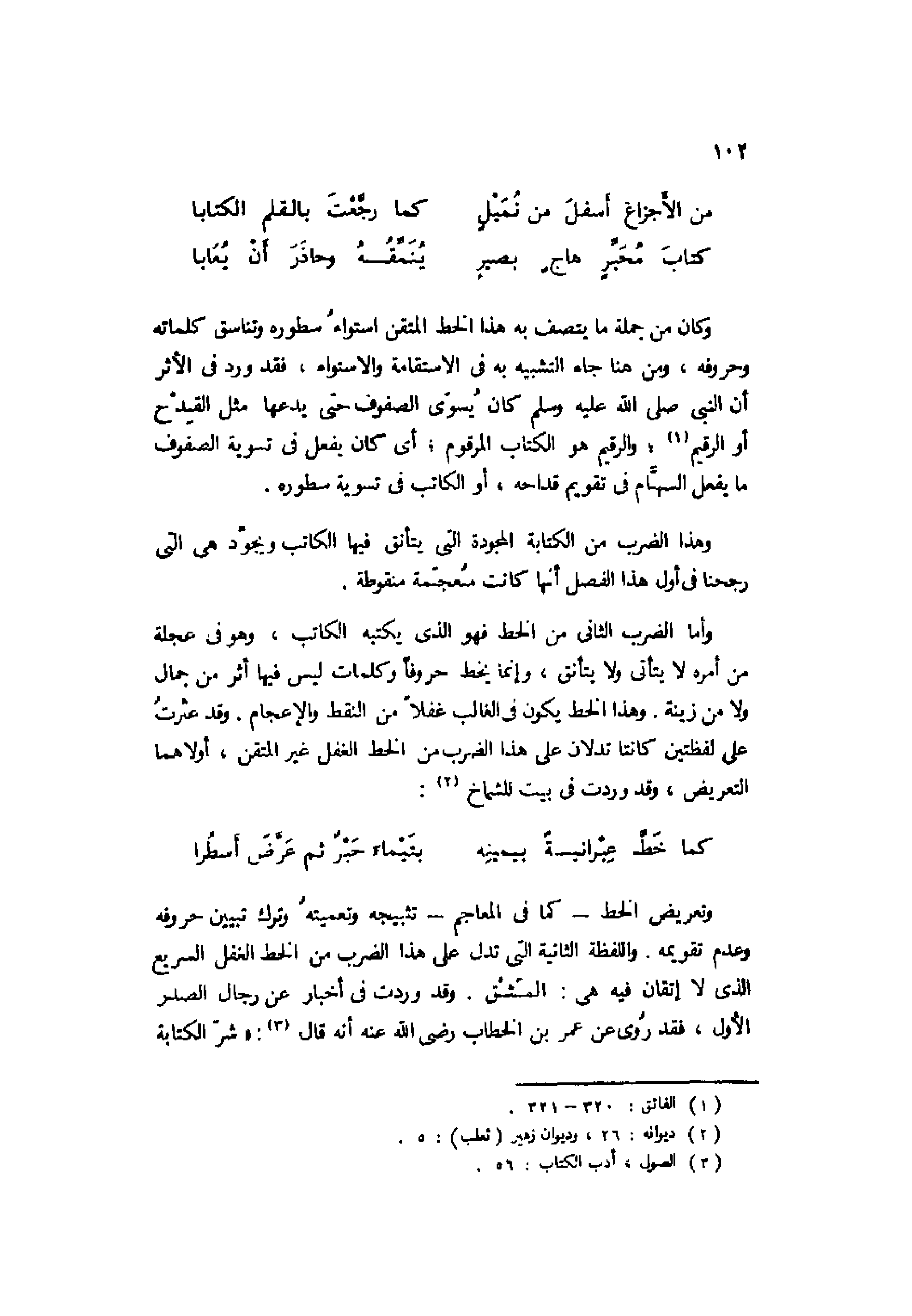 وكان من جملة ما يتصف به هذا الخط المتقن استواء سطوره وتناسق كلماته وحروفه، ومن هنا جاء التشبيه به في الاستقامة والاستواء، فقد ورد في الأثر أن النبي صلى الله عليه وسلم كان يسوي الصفوف حتى يدعها مثل القدح أو الرقيم1؛ والرقيم هو الكتاب المرقوم؛ أي كان يفعل في تسوية الصفوف ما يفعل السهام في تقويم قداحه، أو الكاتب في تسوية سطوره.