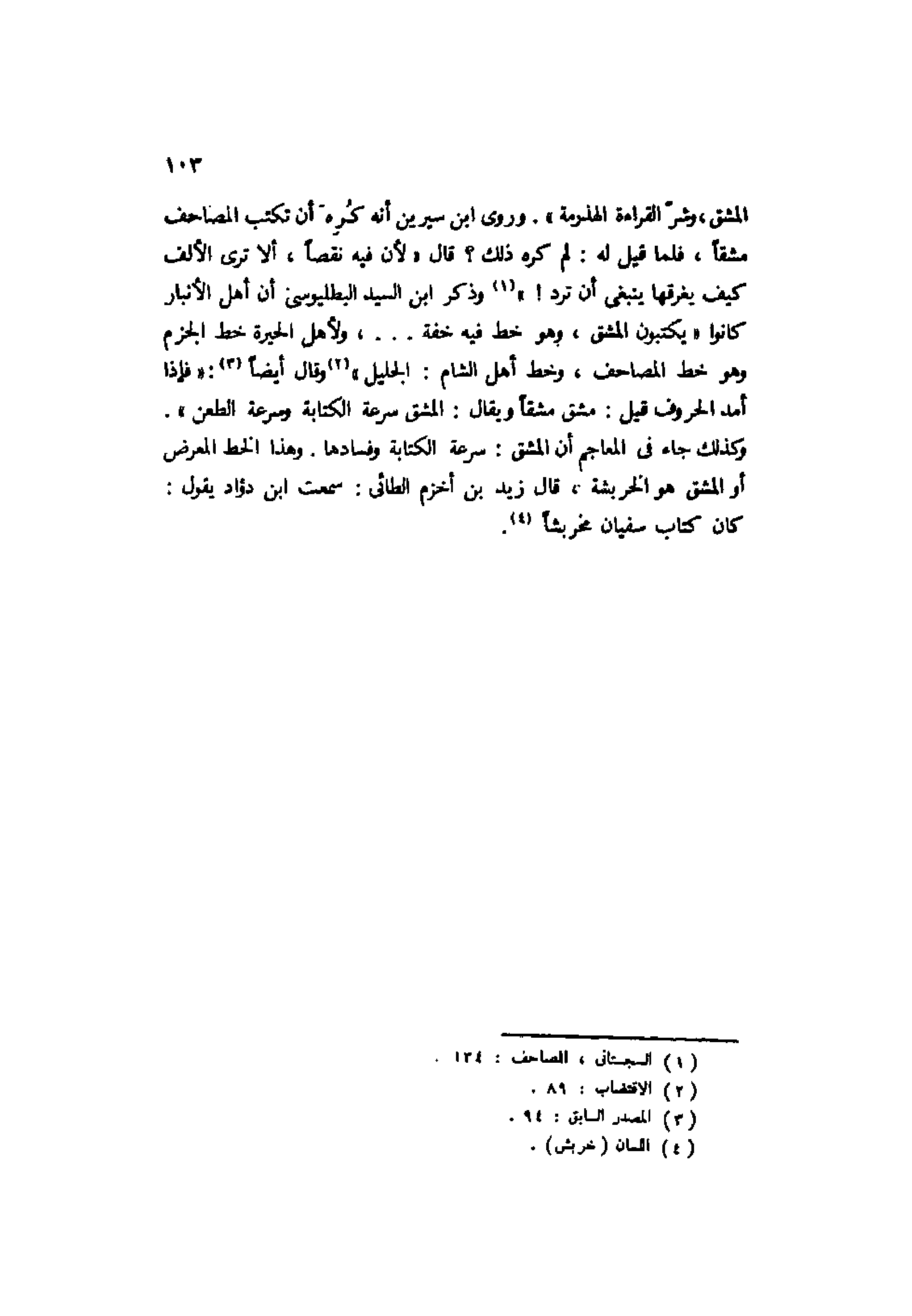 المشق، وشر القراءة الهذرمة". وروى ابن سيرين أنه كره أن تكتب المصاحف مشقًا، فلما قيل له: لم كره ذلك؟ قال: "لأن فيه نقصًا، ألا ترى الألف كيف يغرقها ينبغي أن ترد! "1 وذكر ابن السيد البطليوسي أن أهل الأنبار كانوا "يكتبون المشق، وهو خط فيه خفة ... ، ولأهل الحيرة خط الجزم وهو خط المصاحف، وخط أهل الشام: الجليل"2 وقال أيضًا3: "فإذا أمد الحروف قيل: مشق مشقًا ويقال: المشق سرعة الكتابة وسرعة الطعن".