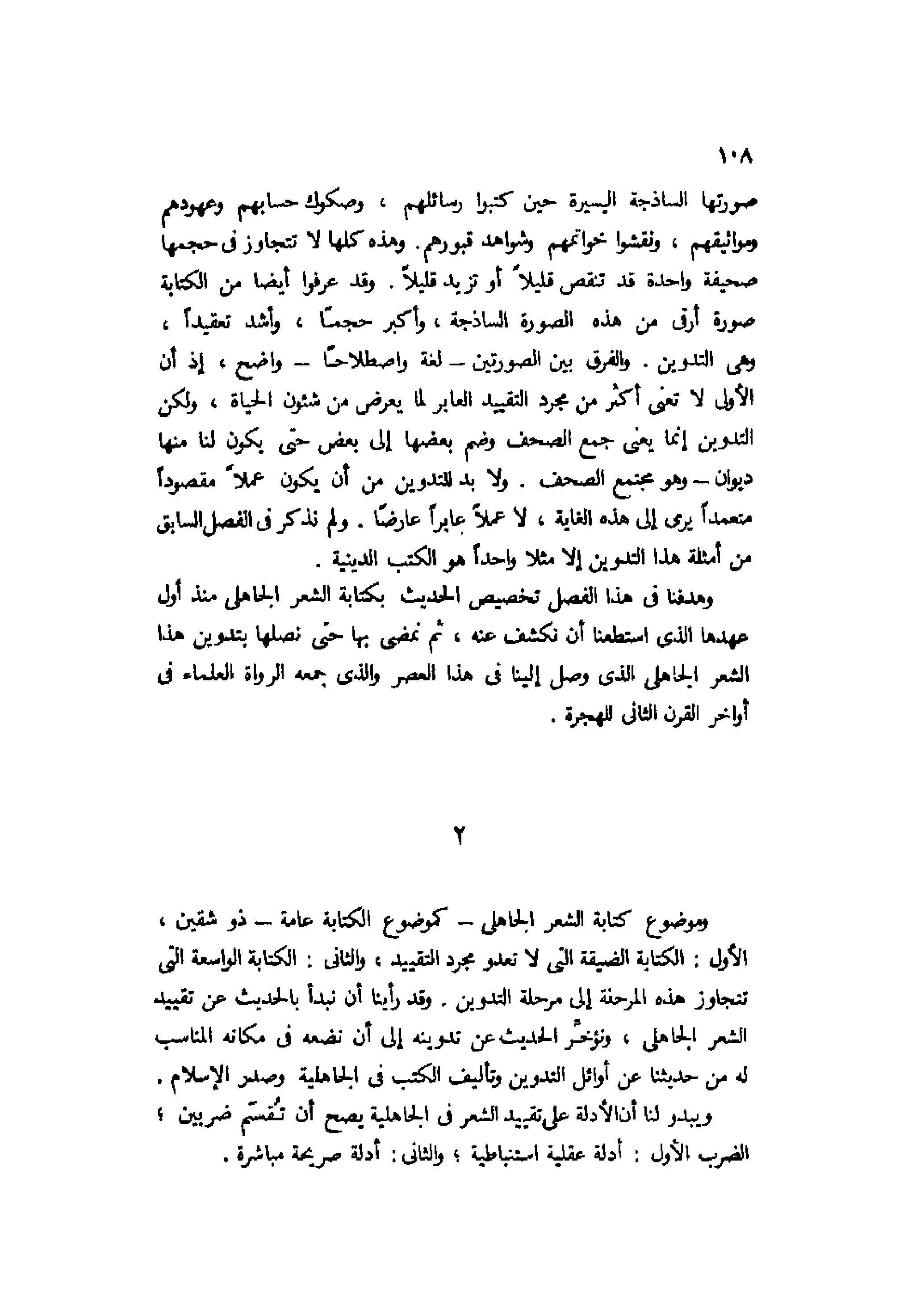 وموضوع كتابة الشعر الجاهلي -كموضوع الكتابة عامة- ذو شقين، الأول: الكتابة الضيقة التي لا تعدو مجرد التقييد، والثاني: الكتابة الواسعة التي تتجاوز هذه المرحلة إلى مرحلة التدوين. وقد رأينا أن نبدأ بالحديث عن تقييد الشعر الجاهلي، ونؤخر الحديث عن تدوينه إلى أن نضعه في مكانه المناسب له من حديثنا عن أوائل التدوين وتأليف الكتب في الجاهلية وصدر الإسلام.
