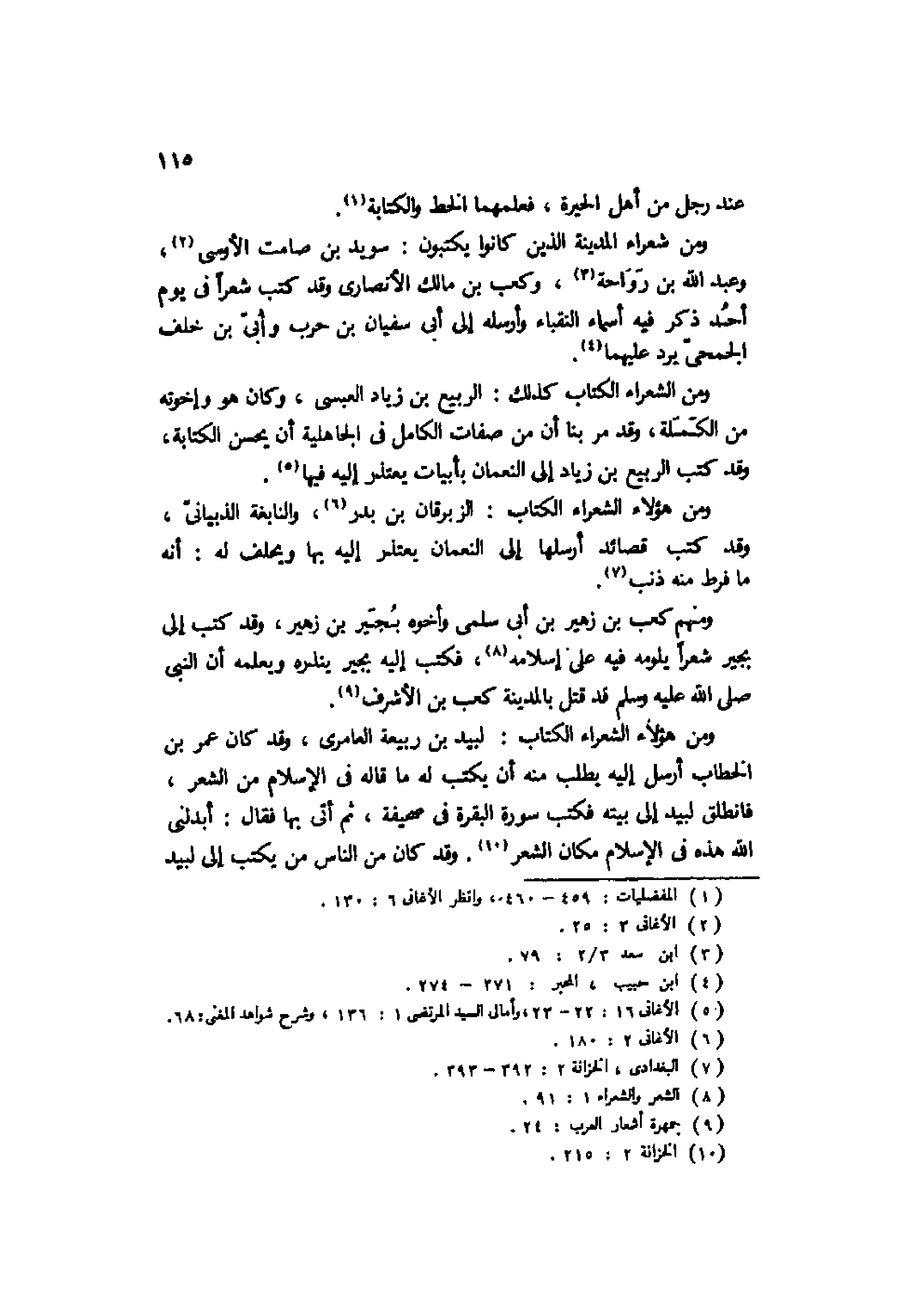 ومن هؤلاء الشعراء الكتاب: لبيد بن ربيعة العامري، وقد كان عمر بن الخطاب أرسل إليه يطلب منه أن يكتب له ما قاله في الإسلام من الشعر، فانطلق لبيد إلى بيته فكتب سورة البقرة في صحيفة، ثم أتى بها فقال: أبدلني الله هذه في الإسلام مكان الشعر10. وقد كان من الناس من يكتب إلى لبيد