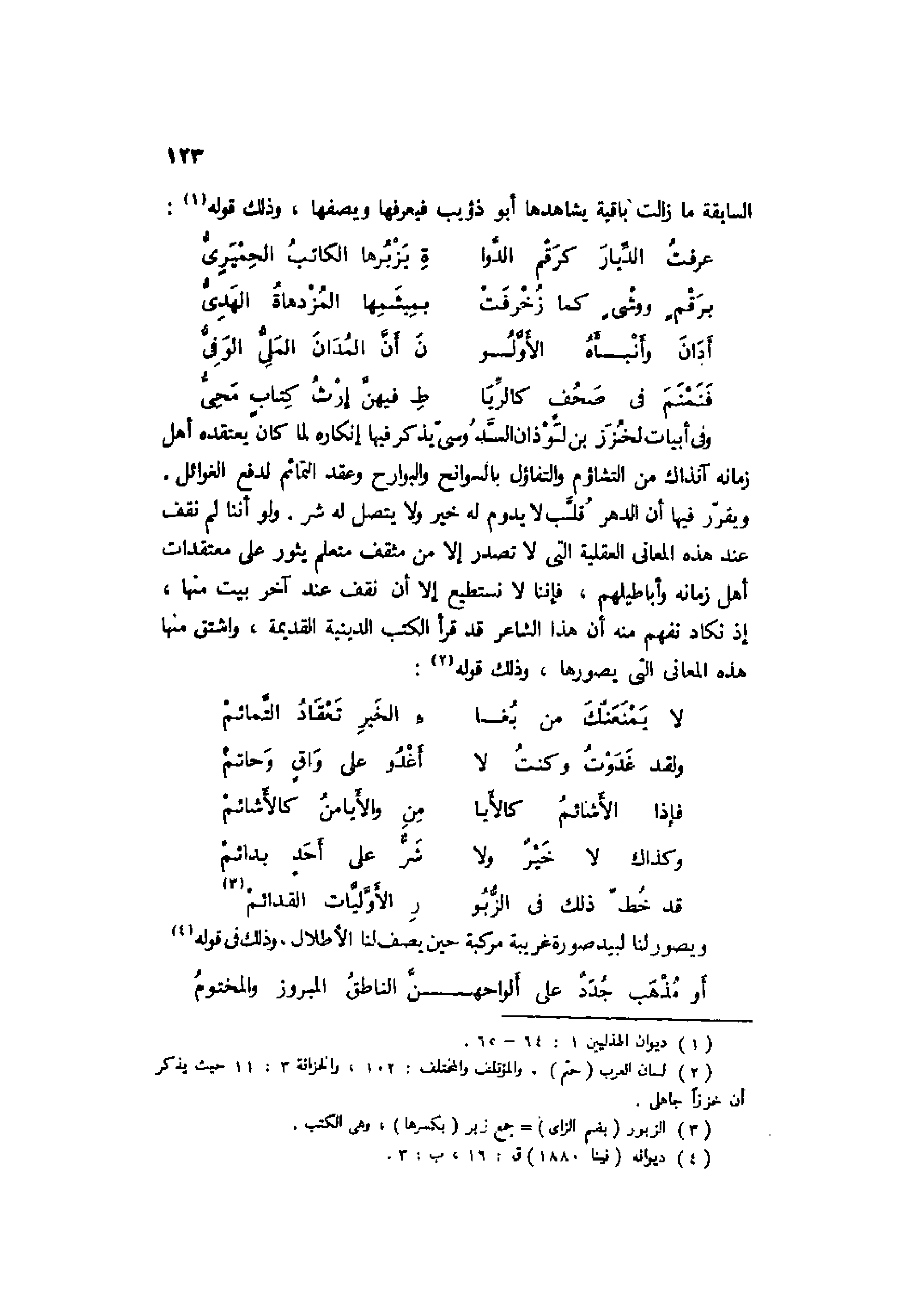 ويقرر فيها أن الدهر قلب لا يدوم له خير ولا يتصل له شر. ولو أننا لم نقف عند هذه المعاني العقلية التي لا تصدر إلا من مثقف متعلم يثور على معتقدات أهل زمانه وأباطيلهم، فإننا لا نستطيع إلا أن نقف عند آخر بيت منها، إذ نكاد نفهم منه أن هذا الشاعر قد قرأ الكتب الدينية القديمة، واشتق منها هذه المعاني التي يصورها، وذلك قوله2: