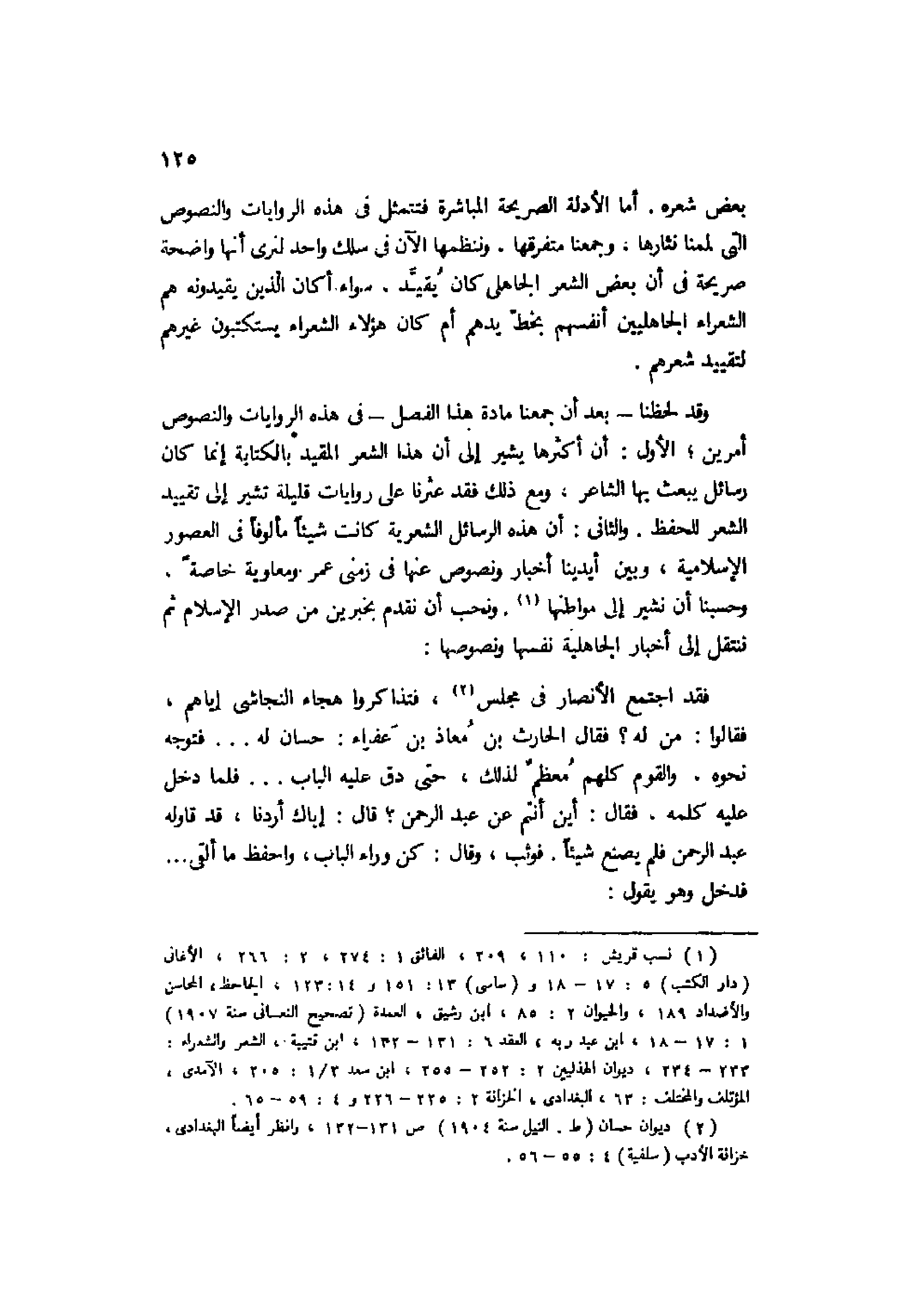 بعض شعره. أما الأدلة الصريحة المباشرة فتتمثل في هذه الروايات والنصوص التي لممنا نثارها. وجمعنا متفرقها. وننظمها الآن في سلك واحد لنرى أنها واضحة صريحة في أن بعض الشعر الجاهلي كان يقيد. سواء أكان الذين يقيدونه هم الشعراء الجاهليين أنفسهم بخط يدهم أم كان هؤلاء الشعراء يستكتبون غيرهم لتقييد شعرهم.