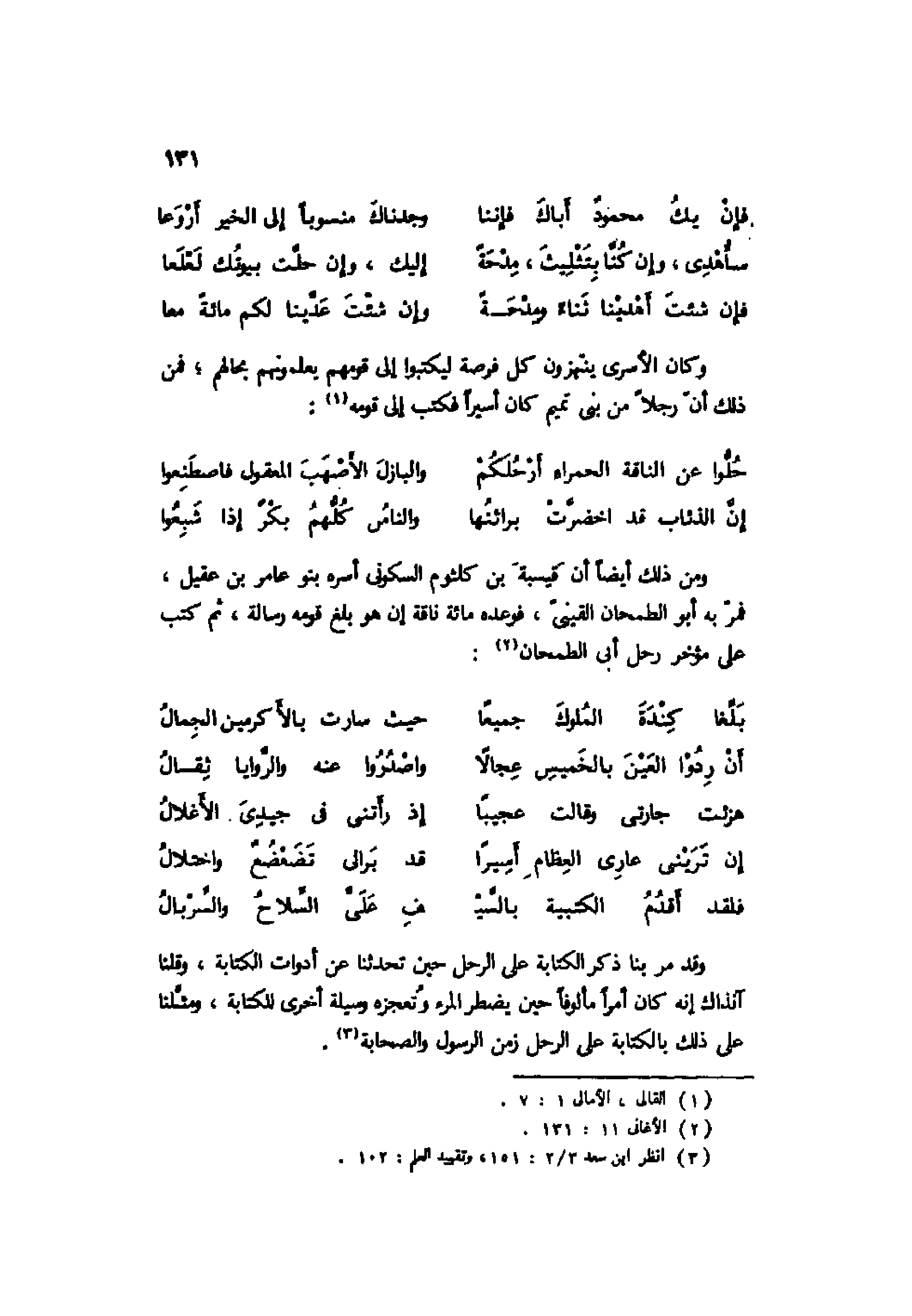 فمر به أبو الطمحان القيني، فوعده مائة ناقة إن هو بلغ قومه رسالة، ثم كتب على مؤخر رحل أبي الطمحان2: